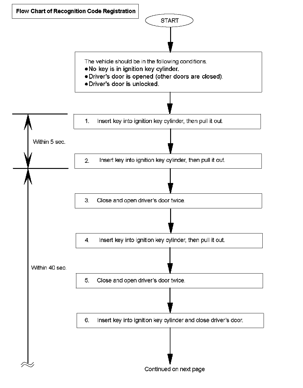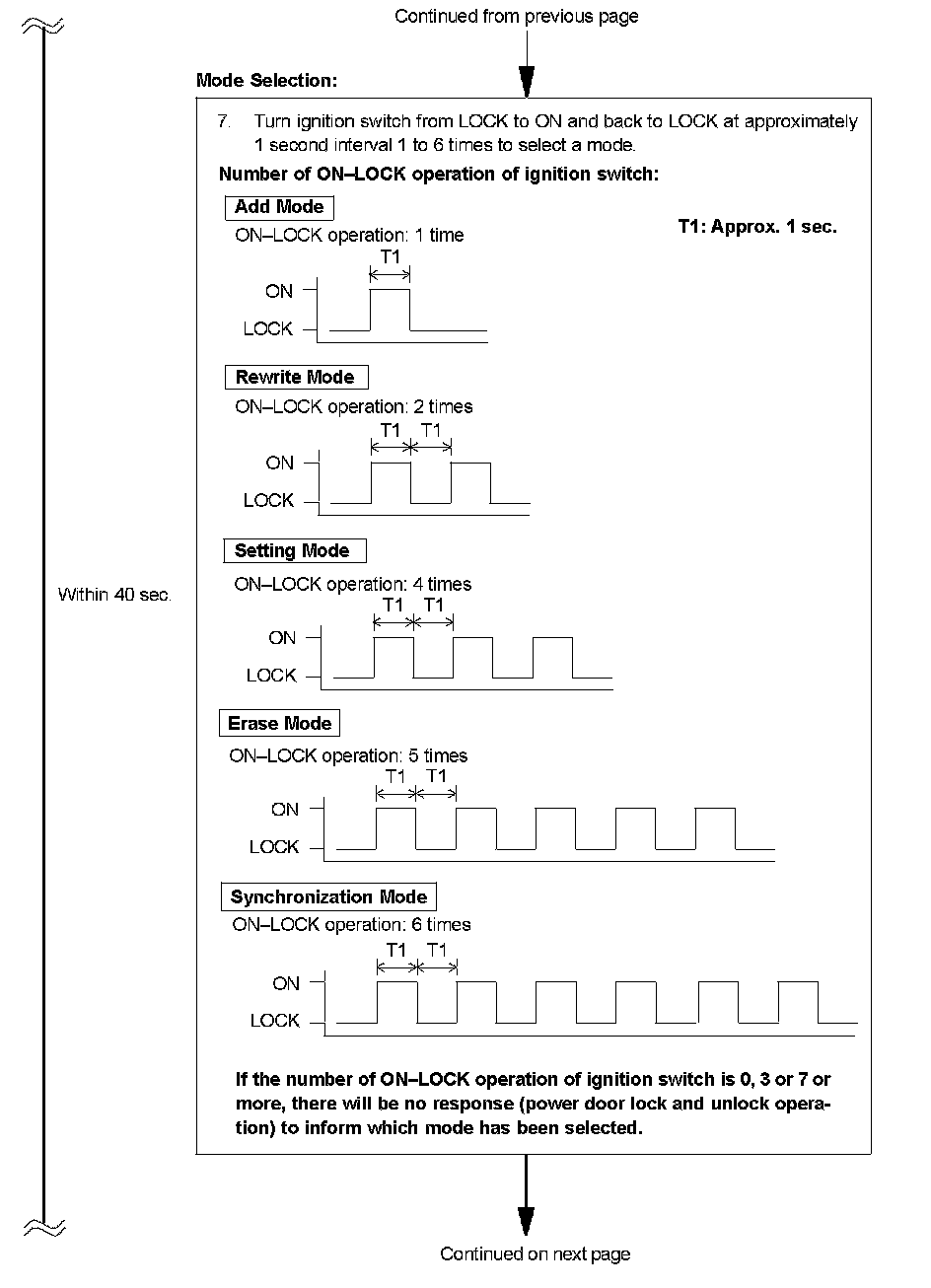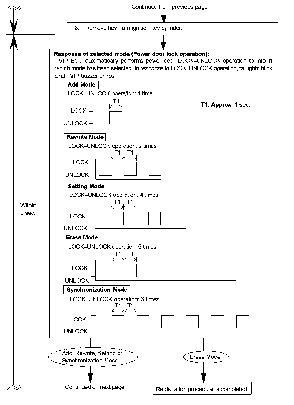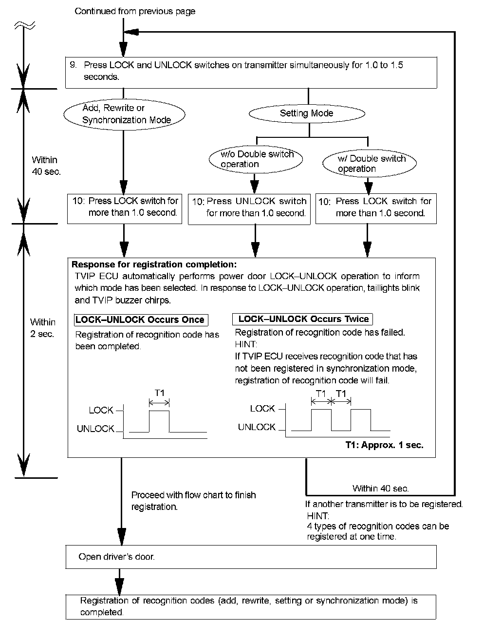 *1: If a switch on the transmitter is pressed while it is out of range ofthe TVIP ECU the system will not be able to synchronize the sequential code (rolling code) with the registered recognition code. At this time the system will automatically synchronize them; however automatic synchronization can be performed only 500 times. Therefore it is necessary to use this mode after they have synchronized 500 times.