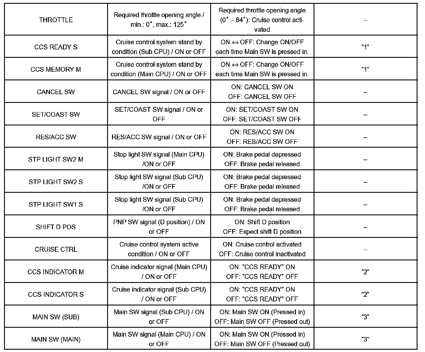 "3" is OK but cruise indicator not turn on �-> Indicator or W/H or ECM failure.