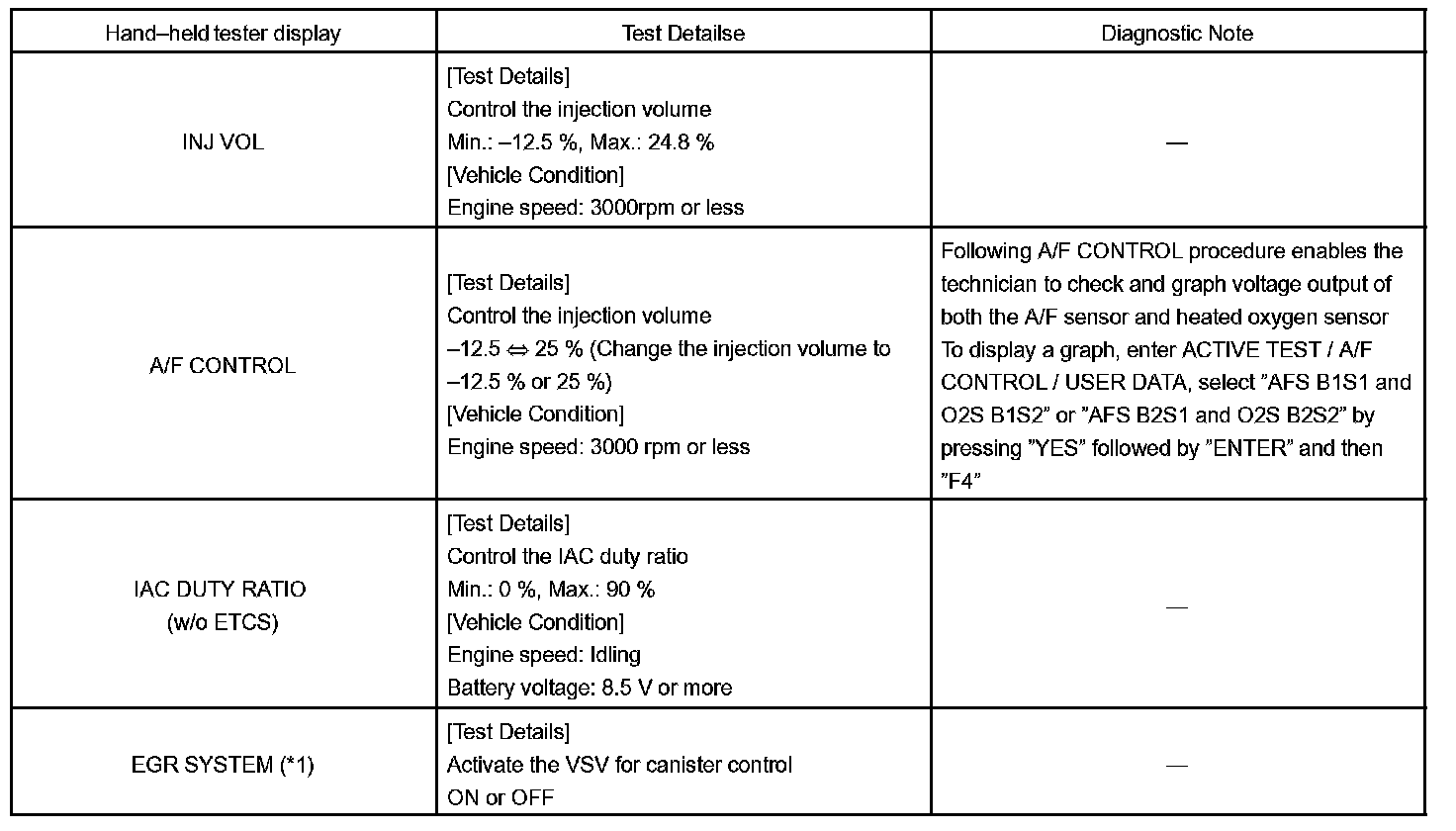 ACTIVE TESTHINT: Performing the ACTIVE TEST using the hand-held tester or the OBD II scan tool allows the relay, VSV, actuator and so on to operate without parts removal. Performing ACTIVE TEST as a first step of troubleshooting is one method to shorten diagnostic time.