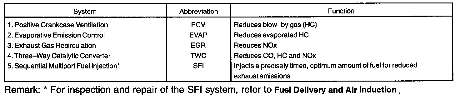 PURPOSEThe emission control Systems are installed to reduce the amount of CO, HC and NOx exhausted from the engine (3, 4 and 5), to prevent the atmospheric release of blow-by gas-containing HC (1) and evaporated fuel containing HC being released from the fuel tank (2).