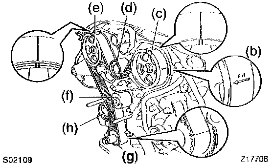 e. Install the timing belt to the RH camshaft timing pulley. Align the installation mark on the timing belt with the timing mark of the camshaft timing pulley.