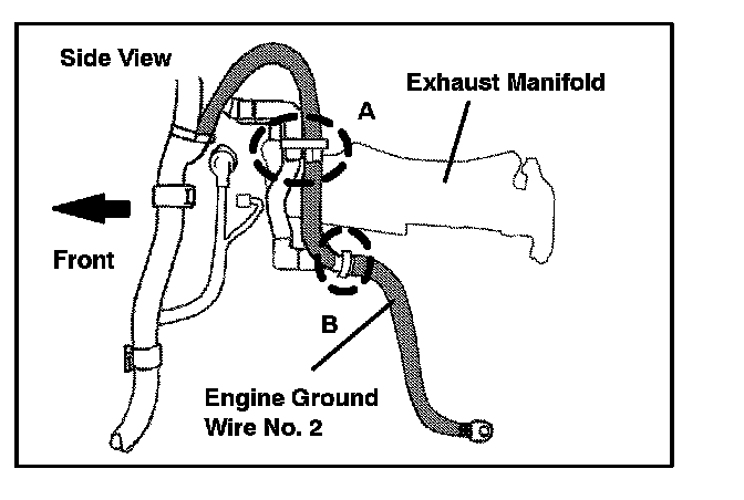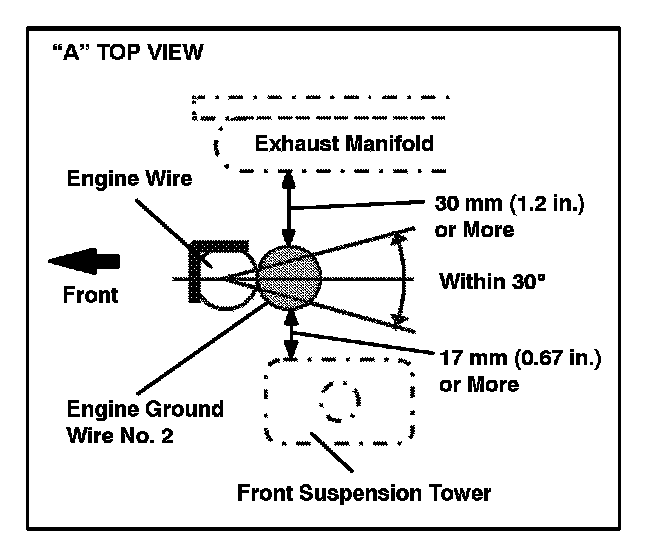 ^ Fasten the engine No. 2 wire 30 mm (1.2 in.) or more apart from the exhaust manifold.