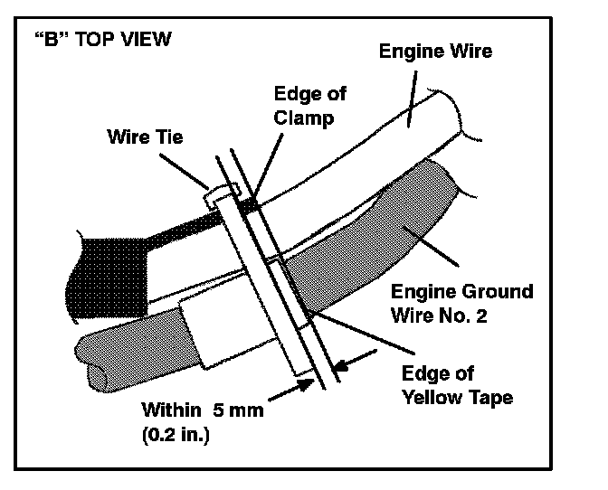 At position "B," align the edge of the clamp with the edge of the yellow tape, and fasten the wires with the wire tie within 5 mm (0.2 in.) from the aligned position.