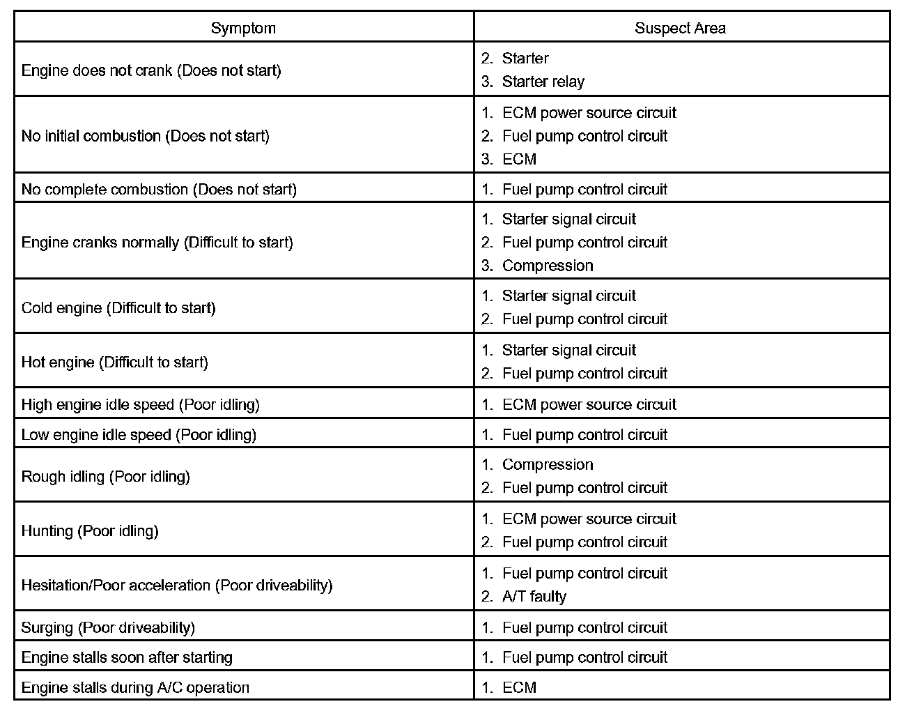 Problem Symptoms Table: