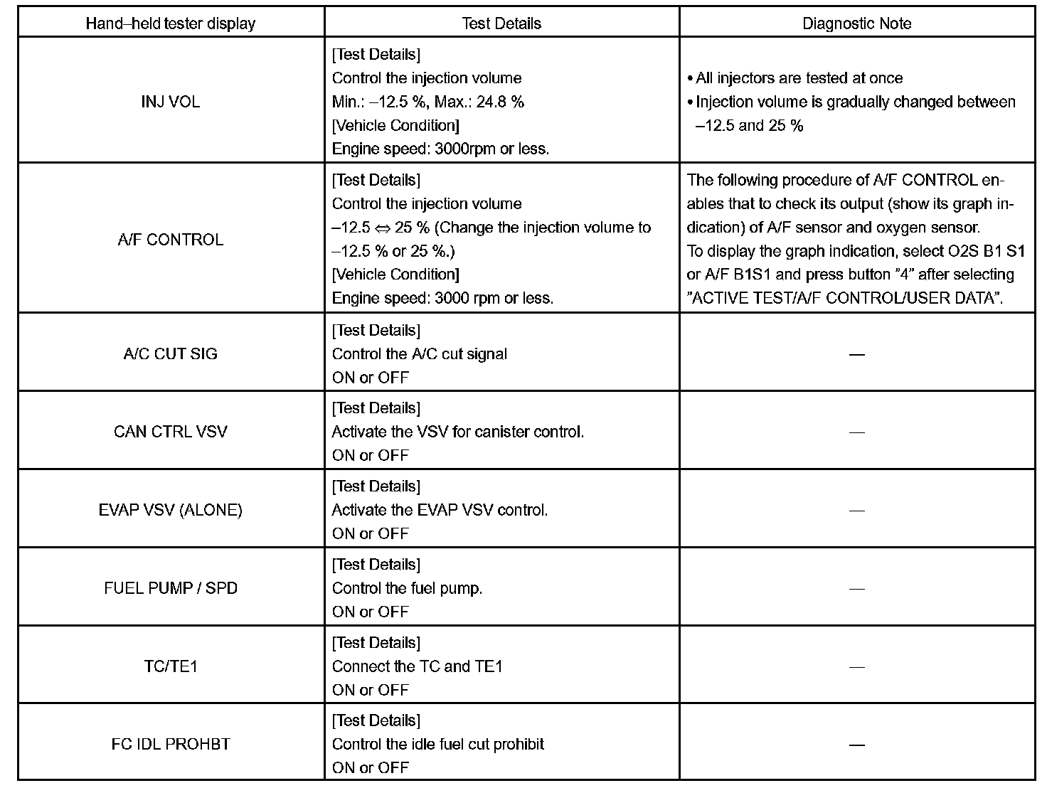 ACTIVE TESTHINT: Performing the ACTIVE TEST using the OBD II scan tool or Hand-held tester allows the relay, VSV, actuator and so on to operate without parts removal. Performing the ACTIVE TEST as a first step of troubleshooting is one of the method to shorten the labor time.