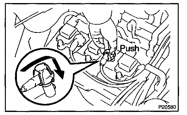1. Using a screwdriver, lift up the lock claw and disconnect the holder from the ignition coils.