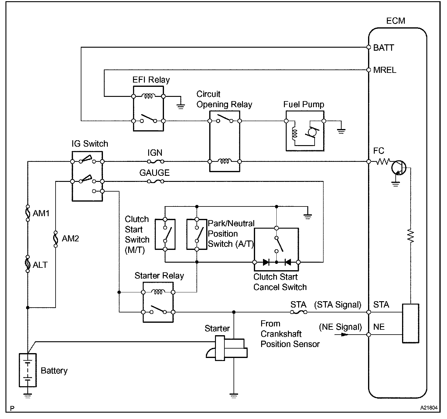 CIRCUIT DESCRIPTIONIn the diagram, when the engine is cranked, current flows from terminal ST of the ignition switch to the starter relay coil and also current flows to terminal STA of the ECM (STA signal).