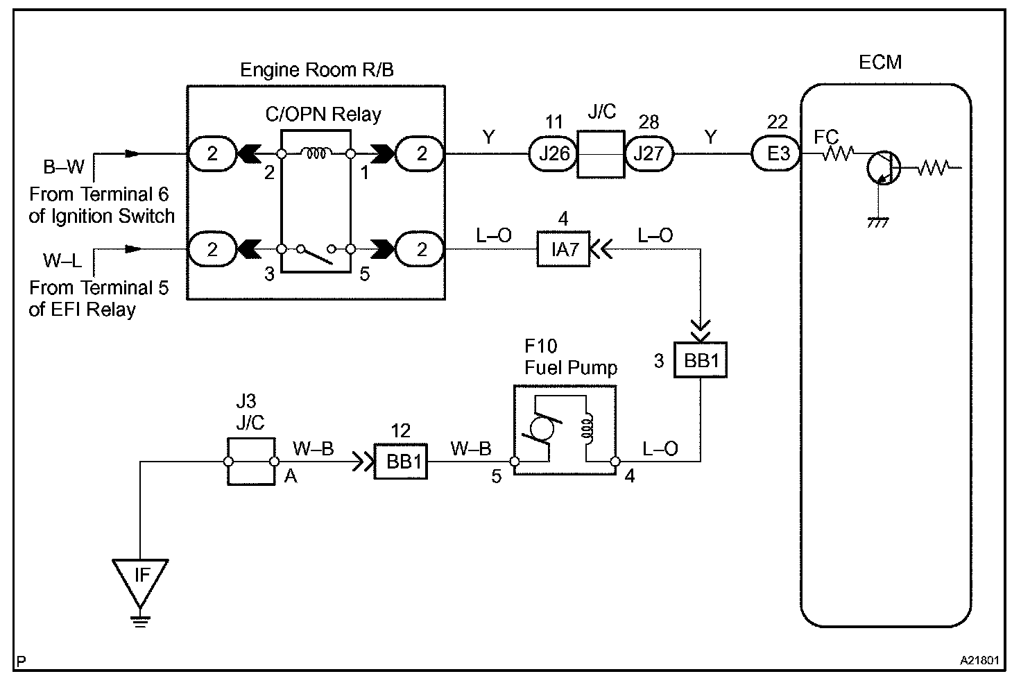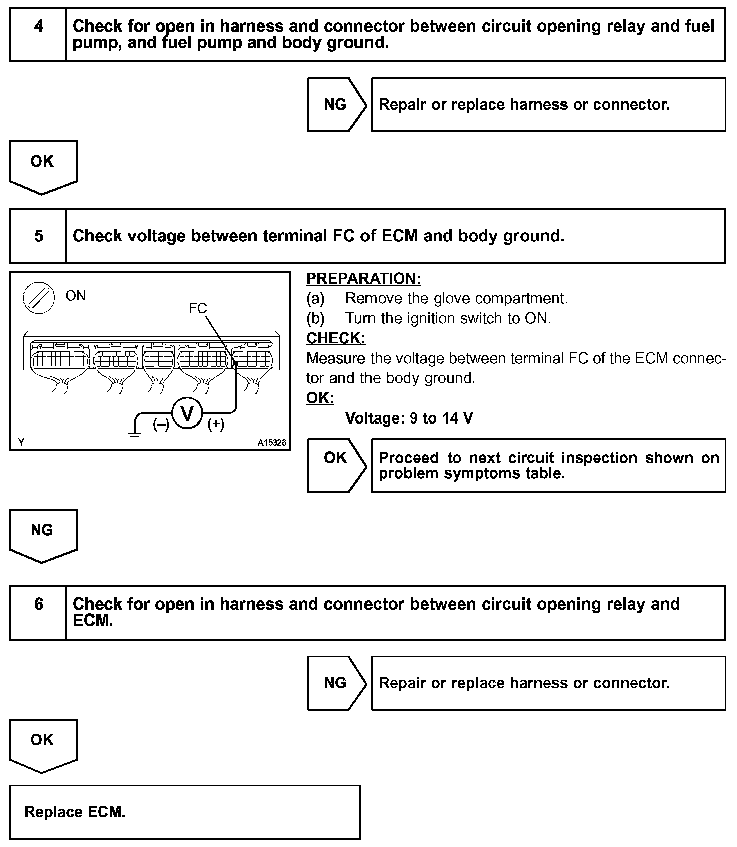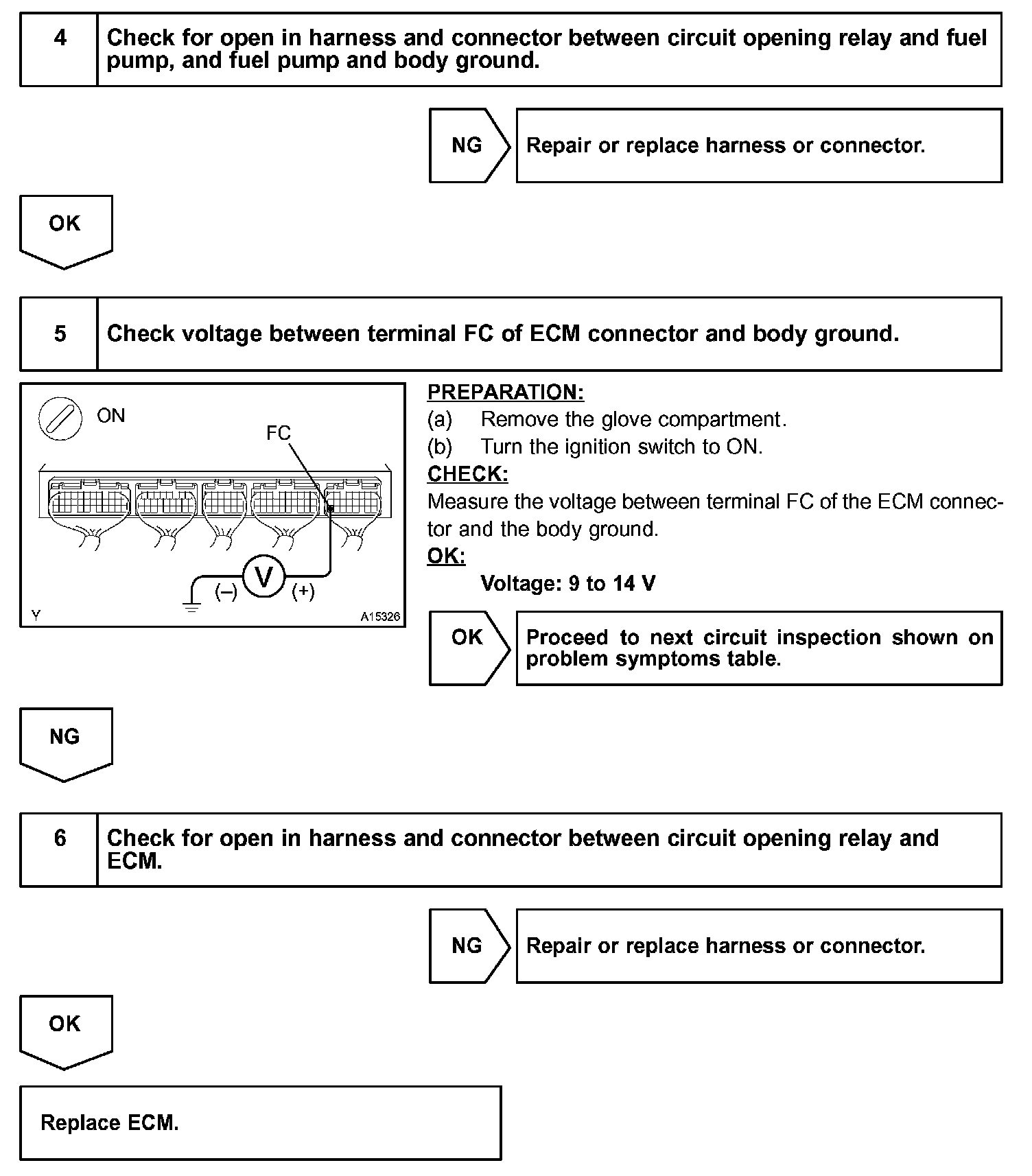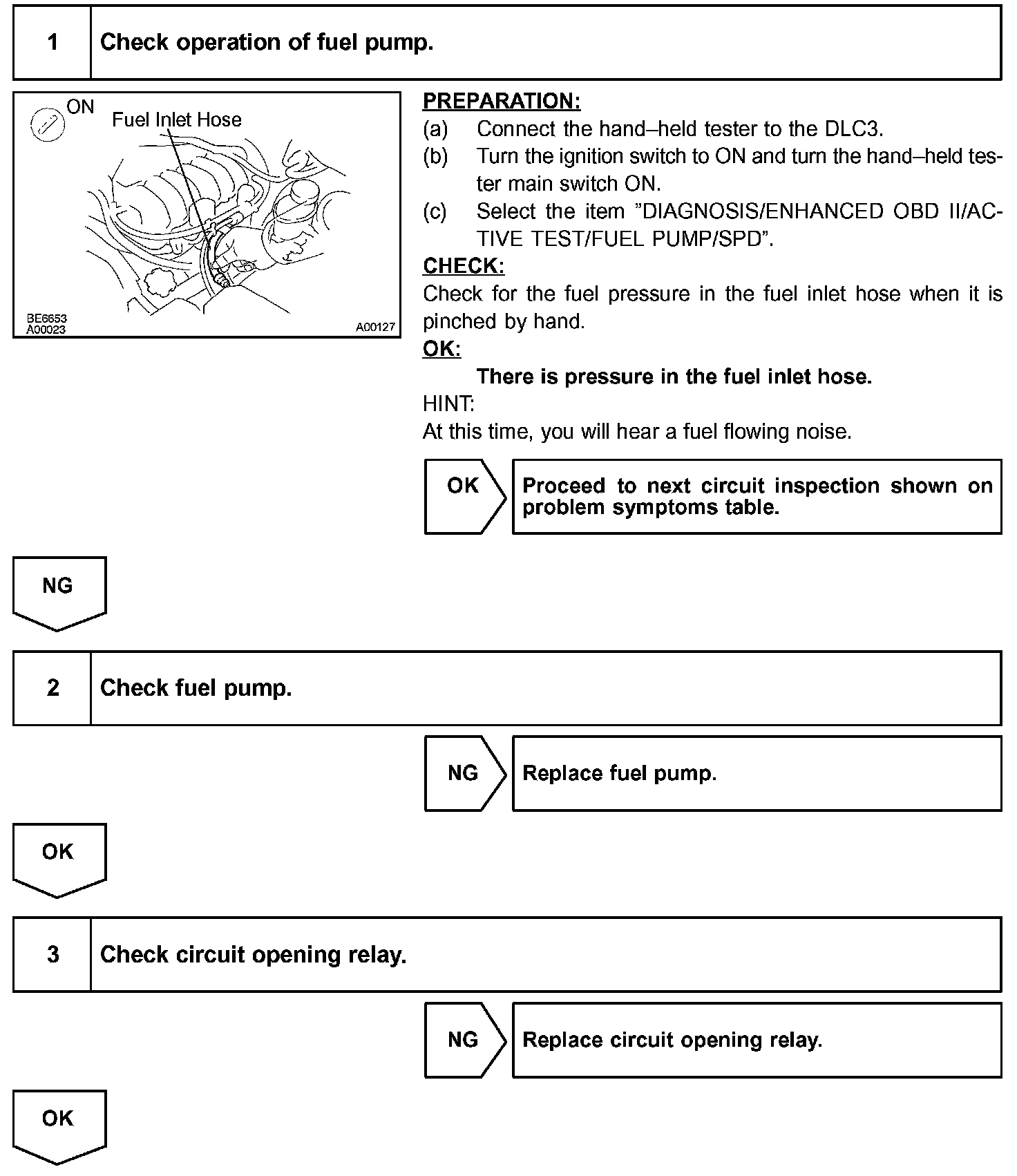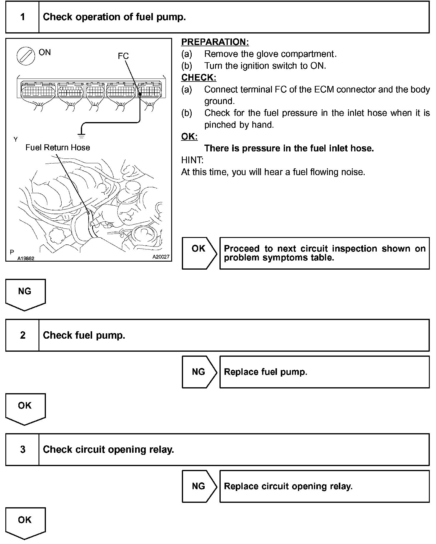 When the STA signal and NE signal are input to the ECM, Tr is turned on, current flows to the coil of the circuit opening relay, the relay switches on, power is supplied to the fuel pump and the fuel pump operates. While the NE signal is generated (engine running), the ECM keeps Tr on (circuit opening relay on) and the fuel pump also keeps operating.