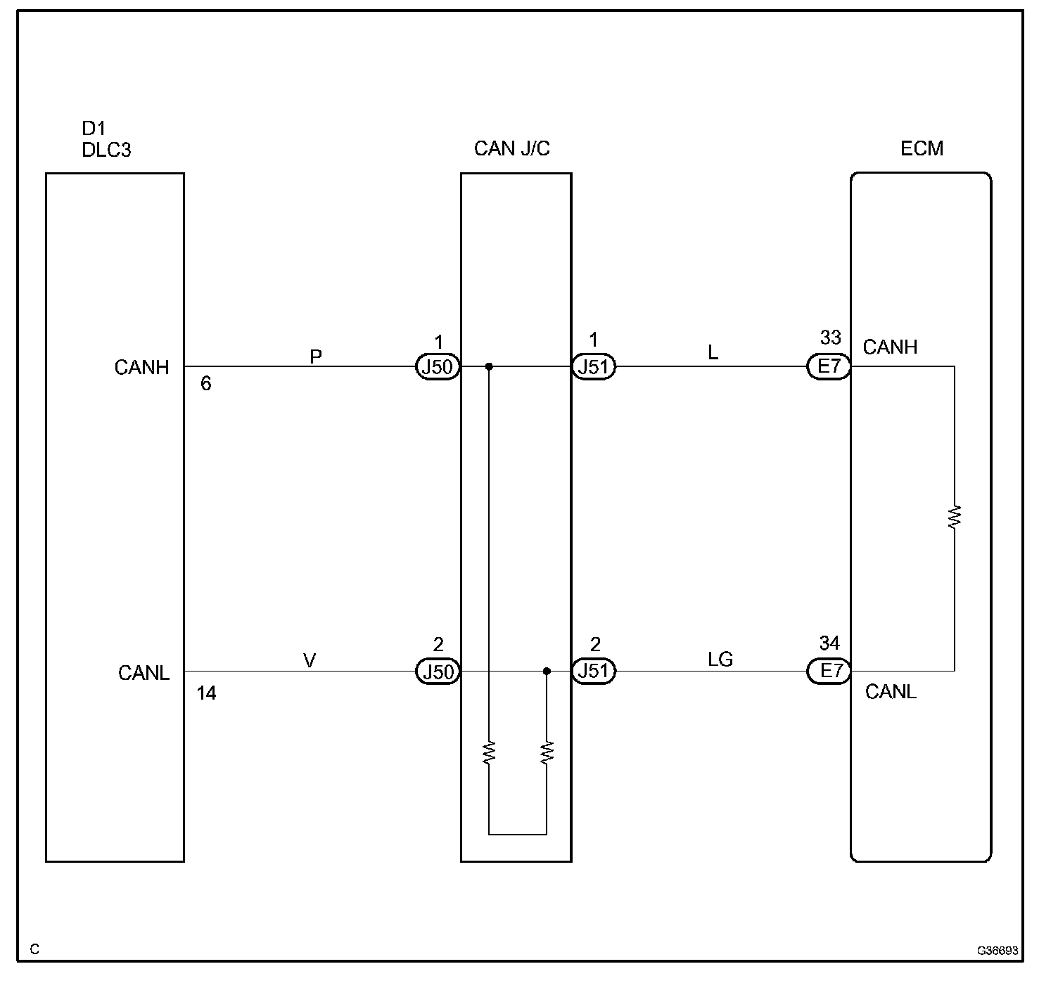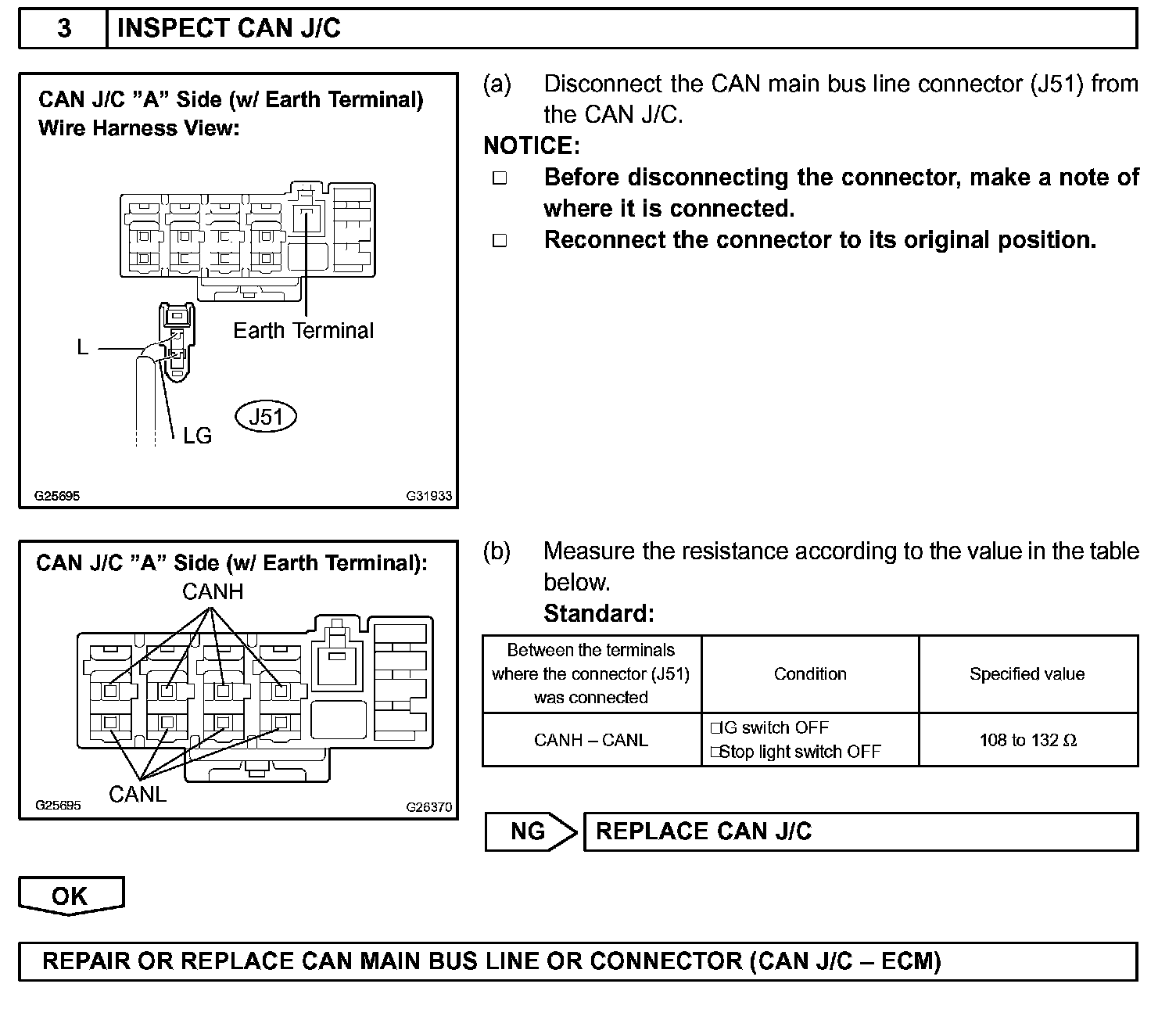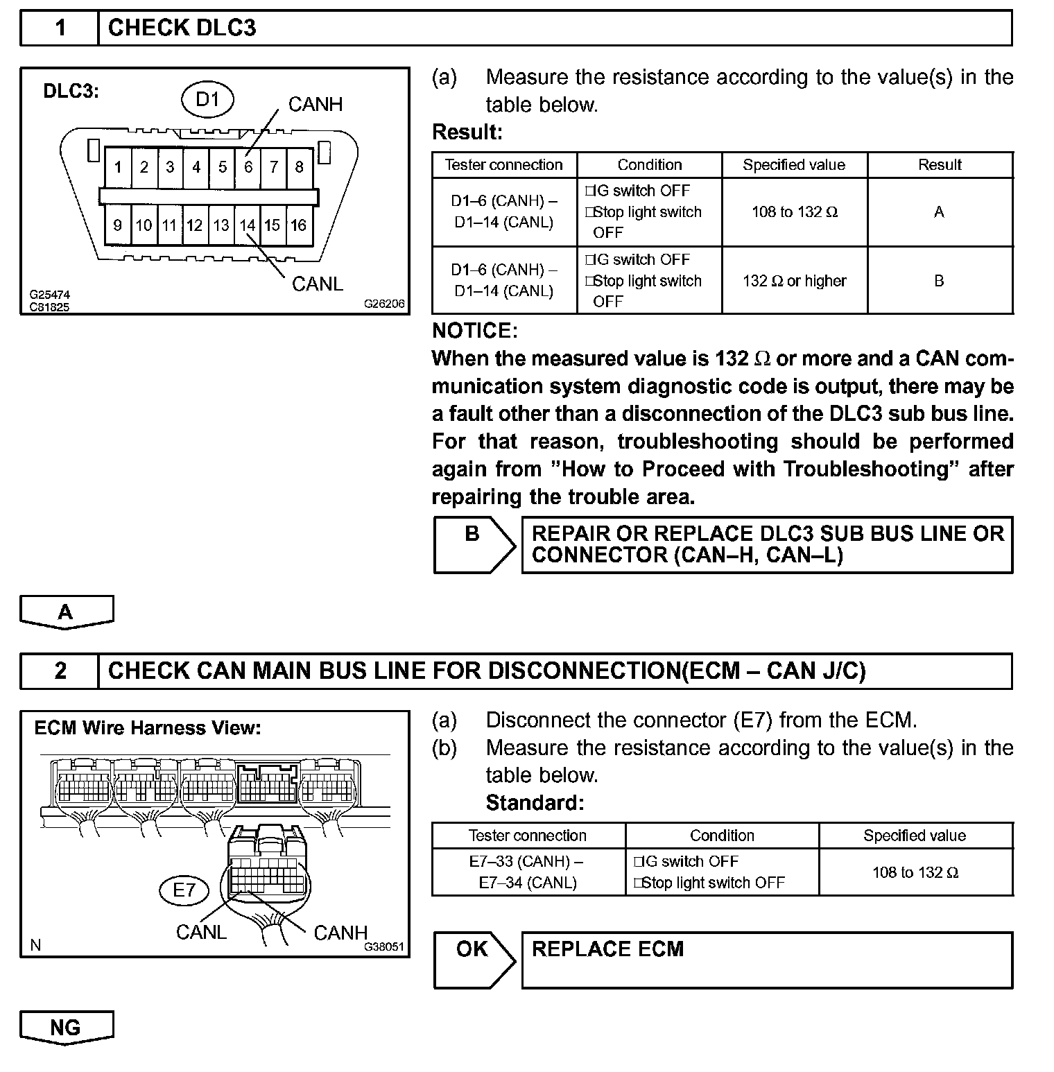 The CAN main bus line and DLC3 sub bus line may have a disconnection when the resistance between terminals 6 (CANH) and 14 (CANL) of the DLC3 is more than 69 Ohm.