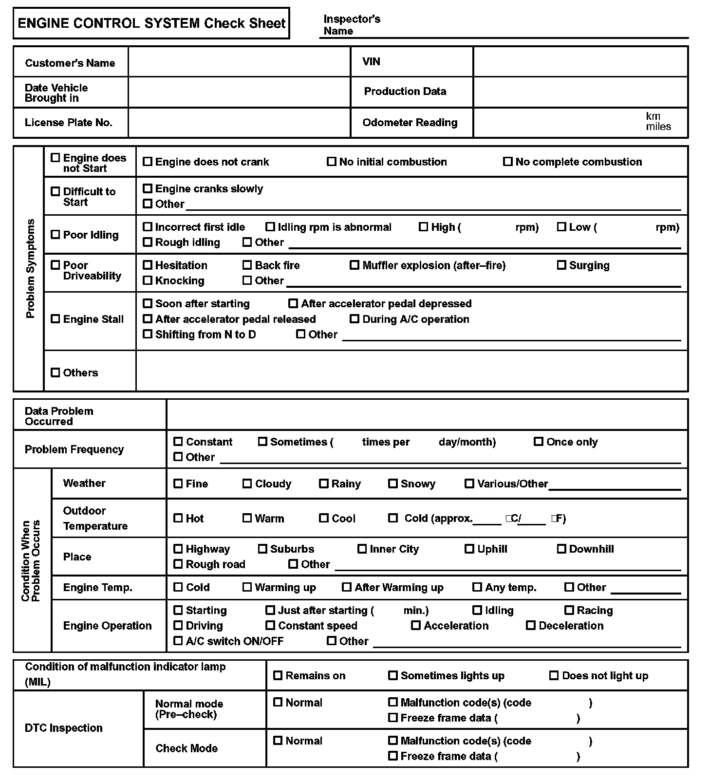 Engine Control System Check Sheet: