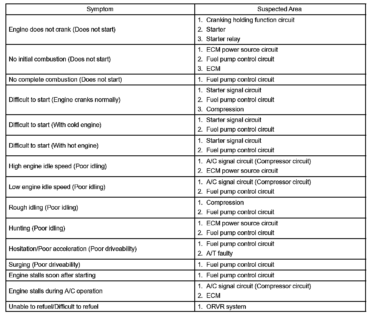 PROBLEM SYMPTOMS TABLE