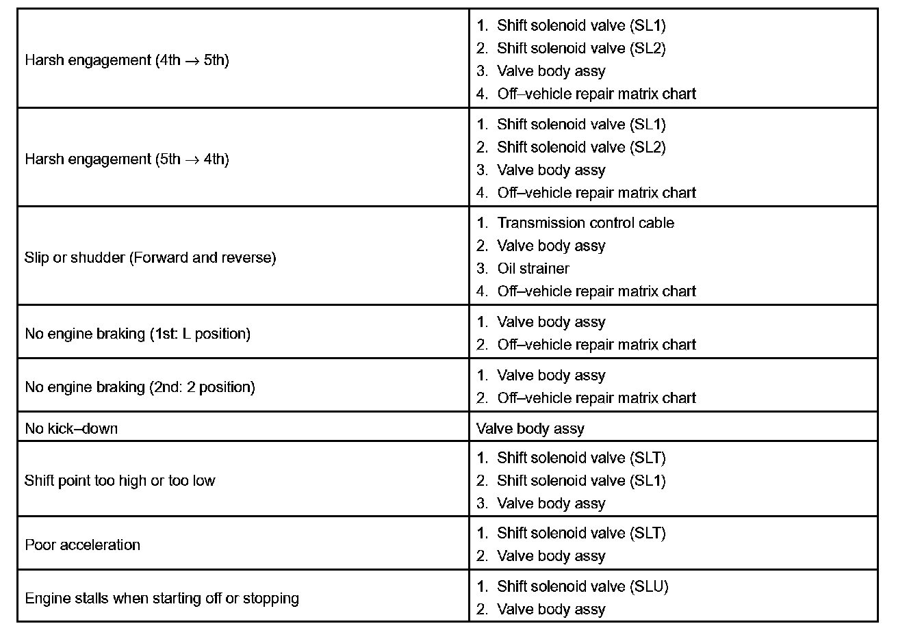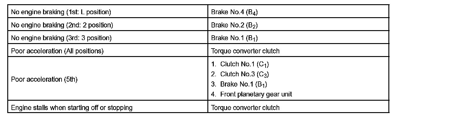 PROBLEM SYMPTOMS TABLEHINT: If a normal code is displayed during the diagnostic trouble code check although the trouble still occurs, check the electrical circuits for each symptom in the order given in the charts and proceed to the given troubleshooting.