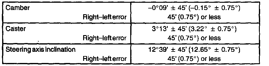 If the steering axis inclination is not as specified after camber and caster have been correctly adjusted, recheck the steering knuckle and front wheel for distortion or looseness.