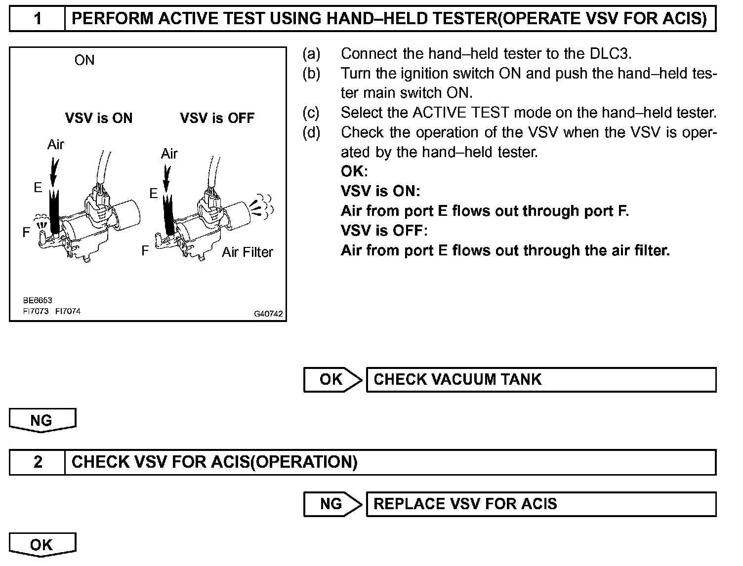 When the engine speed is 4,700 rpm or more and the throttle valve opening angle is 60° or more, the VSV is OFF, so the is IACV open. All the other times, the ECM turns the VSV ON and closes the IACV.