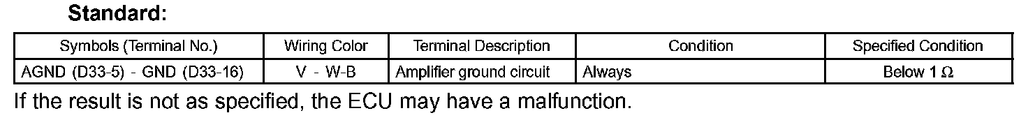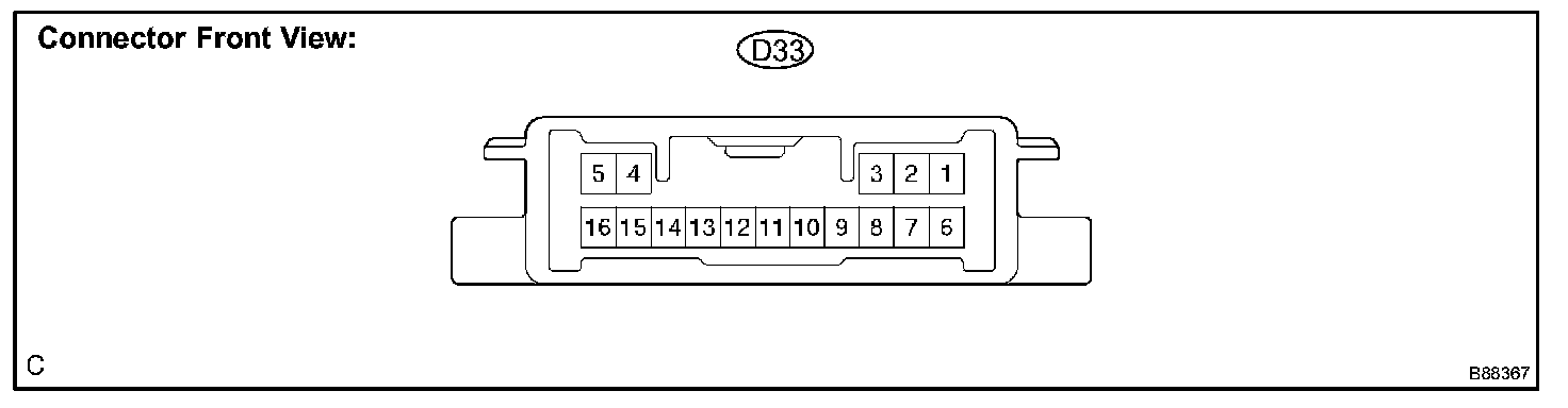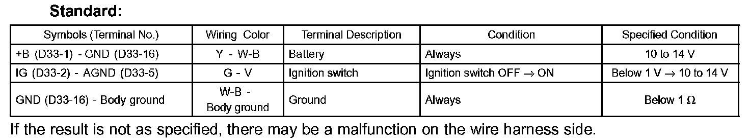 a. Disconnect the D33 ECU connector, and measure the voltage and resistance between each terminal of the wire harness side connector.
