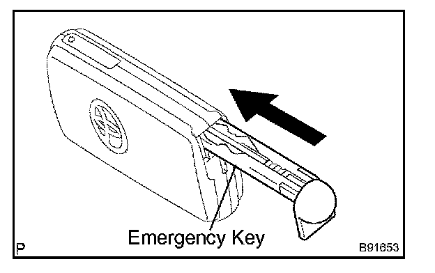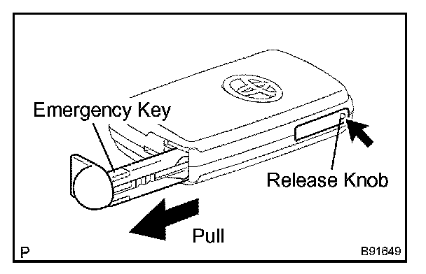 a. Push and hold the release knob in the direction indicated by the arrow in the illustration. Take the emergency key out of the transmitter case.