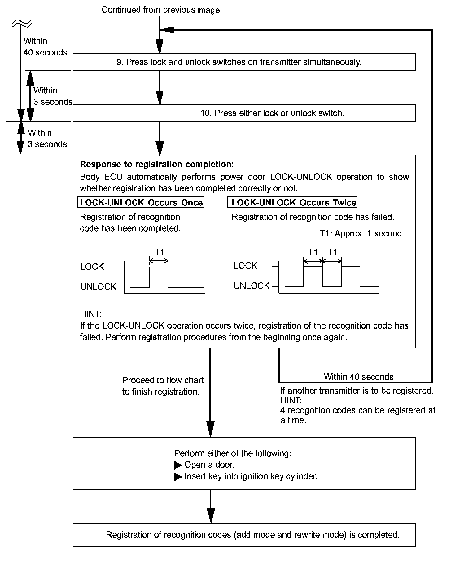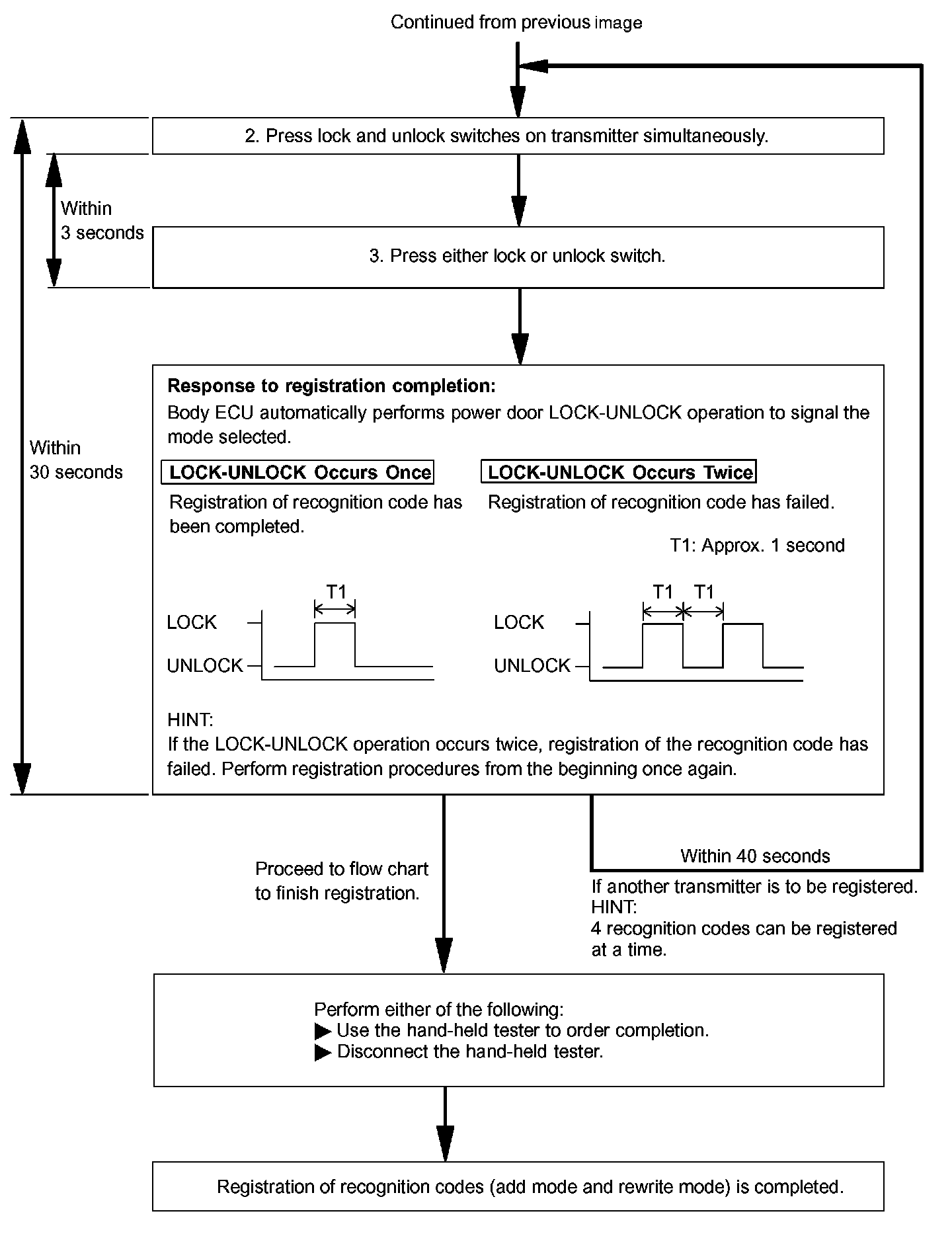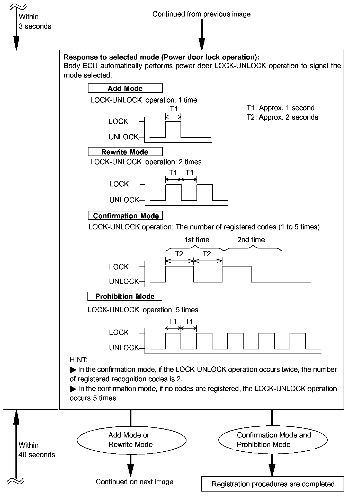 - Add mode is used to register new recognition codes while still retaining codes already registered. This mode is used when a new transmitter is added. If the number of registered codes exceeds 4, the previously registered codes will be erased in order, starting from the oldest registered code.