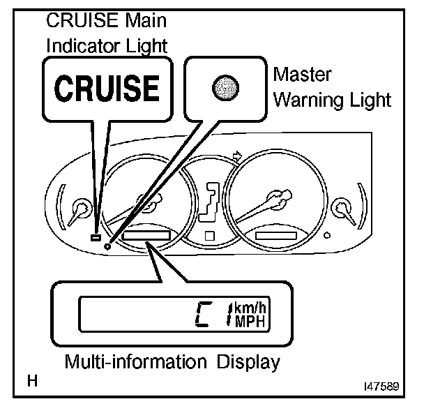 a. The CRUISE main indicator light keeps blinking until the main switch is turned off, the master warning light comes on with a popping sound, and the display shows "E3". The cruise control operation is suspended until turning the main switch ON again. The auto cancel function deletes the stored vehicle speed and cancels the cruise control operation in the following conditions.