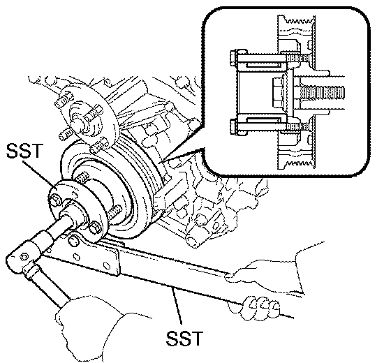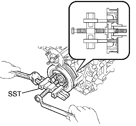 b. Using the pulley set bolt and SST, remove the crankshaft pulley.