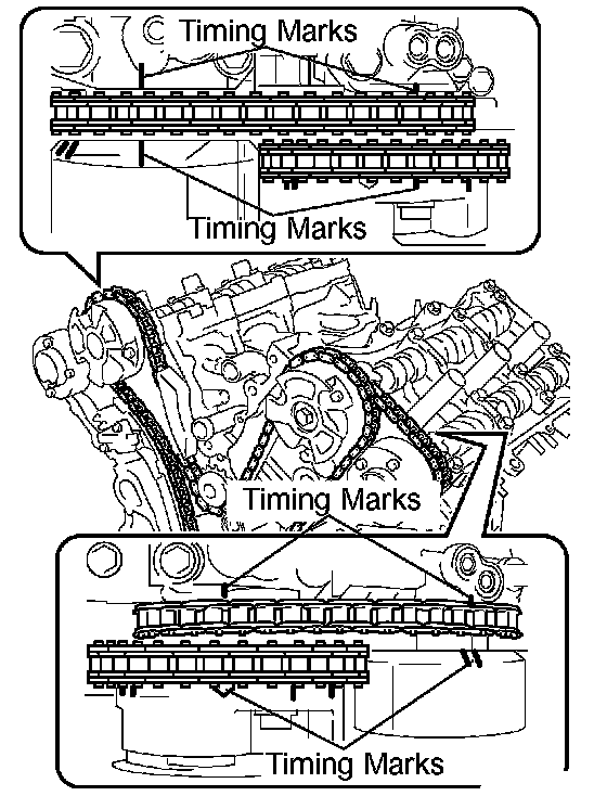 c. Check that the timing marks of the camshaft timing gears are aligned with the timing marks of the bearing caps as shown in the illustration.
