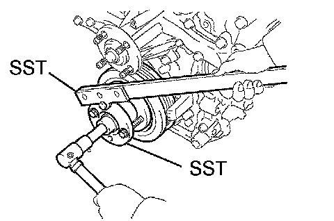 a. Using SST, hold the crankshaft pulley and loosen the pulley set bolt.