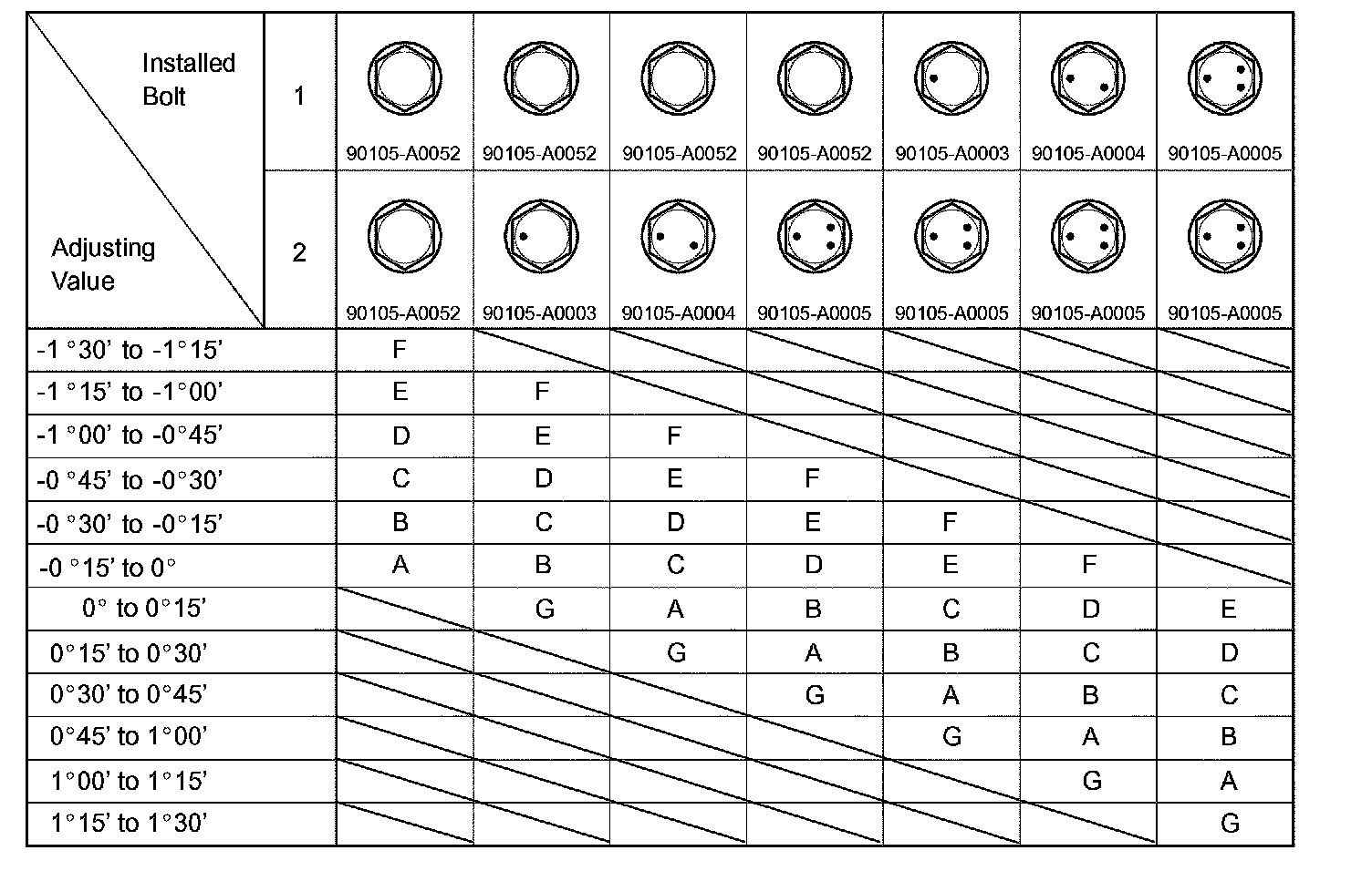 Check installed bolts combination. Select appropriate bolts from the table to adjust the camber to within the specified range.