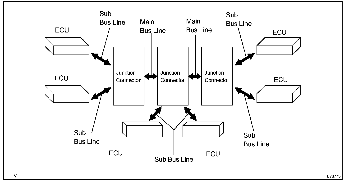 The CAN uses the multi star style bus connection. The 3 junction connectors are connected by a main bus line. Junction connectors communicate with ECUs using a sub bus line.