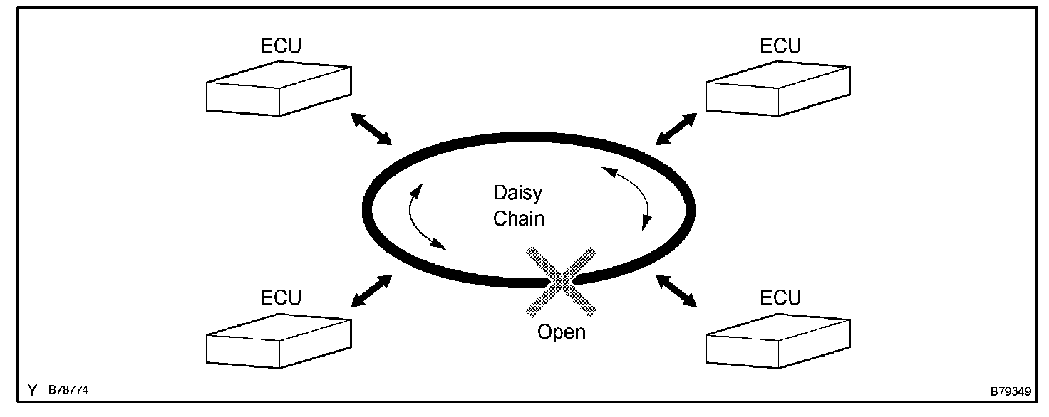 The BEAN uses ring and bus styles of networks to connect ECUs. This style of connection is called a daisy chain. In a daisy chain, communication can be maintained even if there is an area that has an open circuit.