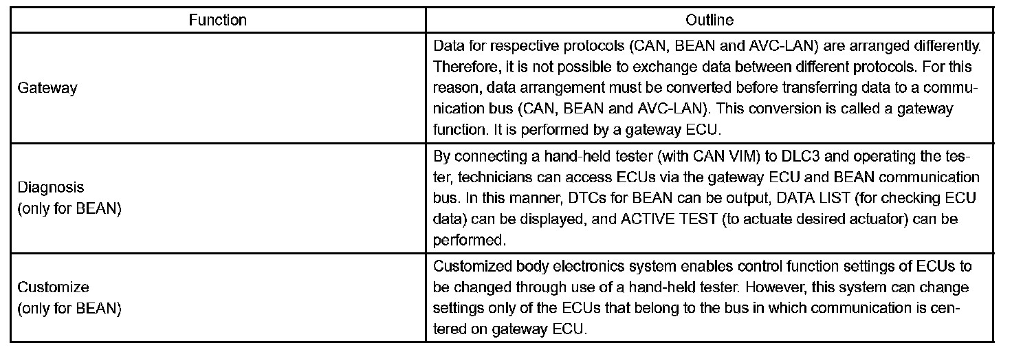 The gateway ECU of the AVALON has the following functions:
