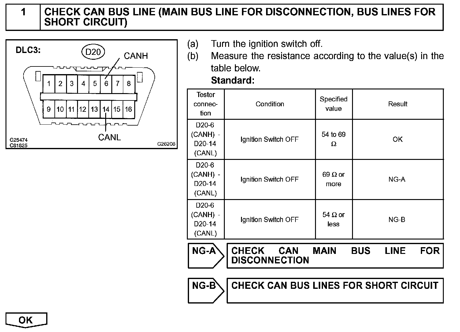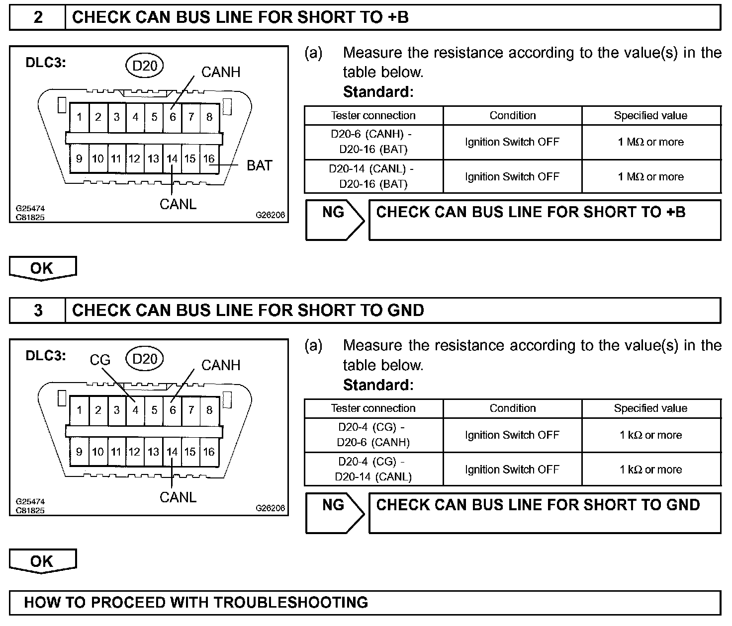 When any DTC for the CAN communication system is output, first measure the resistance between the terminals of the DLC3 to specify the trouble area, and the check that there is no short in the CAN main bus line, between the CAN bus lines, to +B or to GND.
