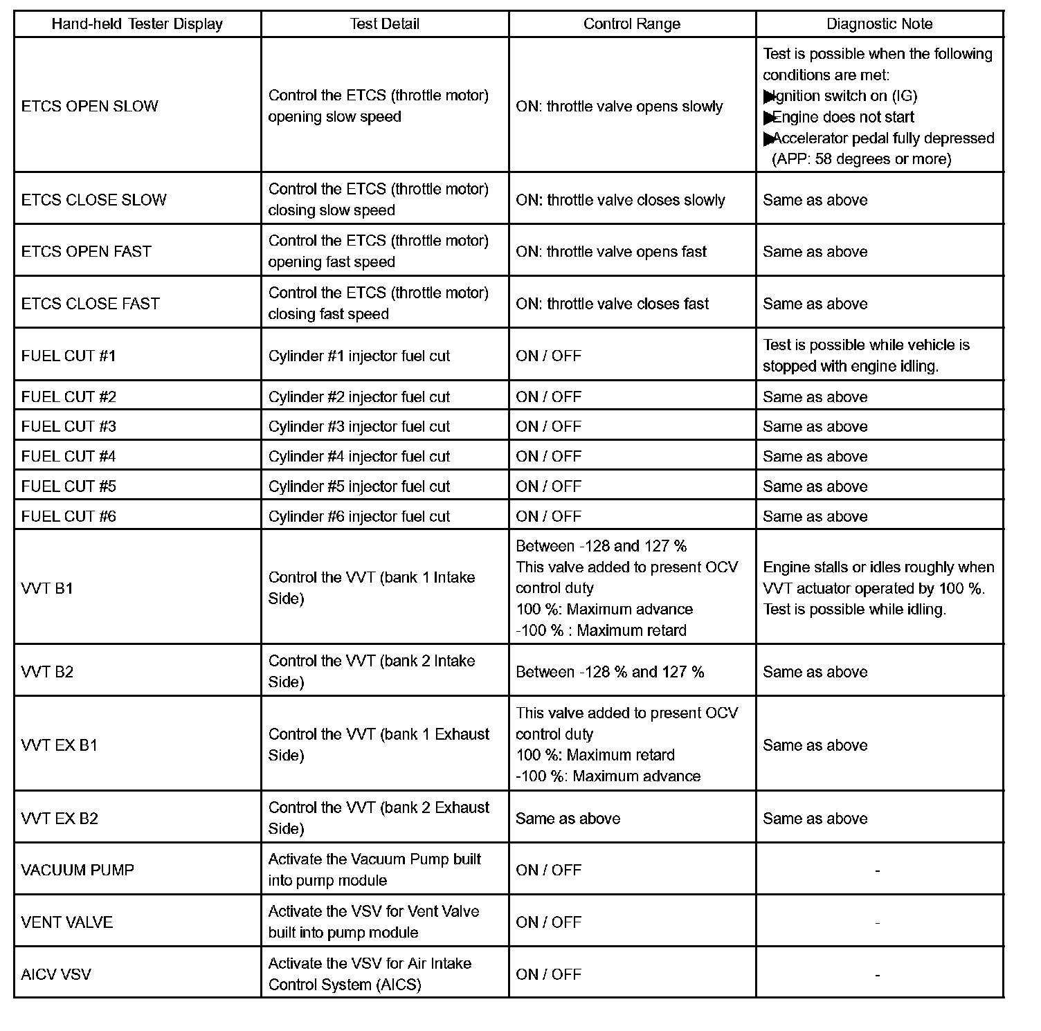 ACTIVE TESTHINT: Performing an ACTIVE TEST enables components including the relays, VSV (Vacuum Switching Valve), and actuators, to be operated without removing any parts. The ACTIVE TEST can be performed with a hand-held tester. Performing an ACTIVE TEST as the first step of troubleshooting is one method to shorten diagnostic time.
