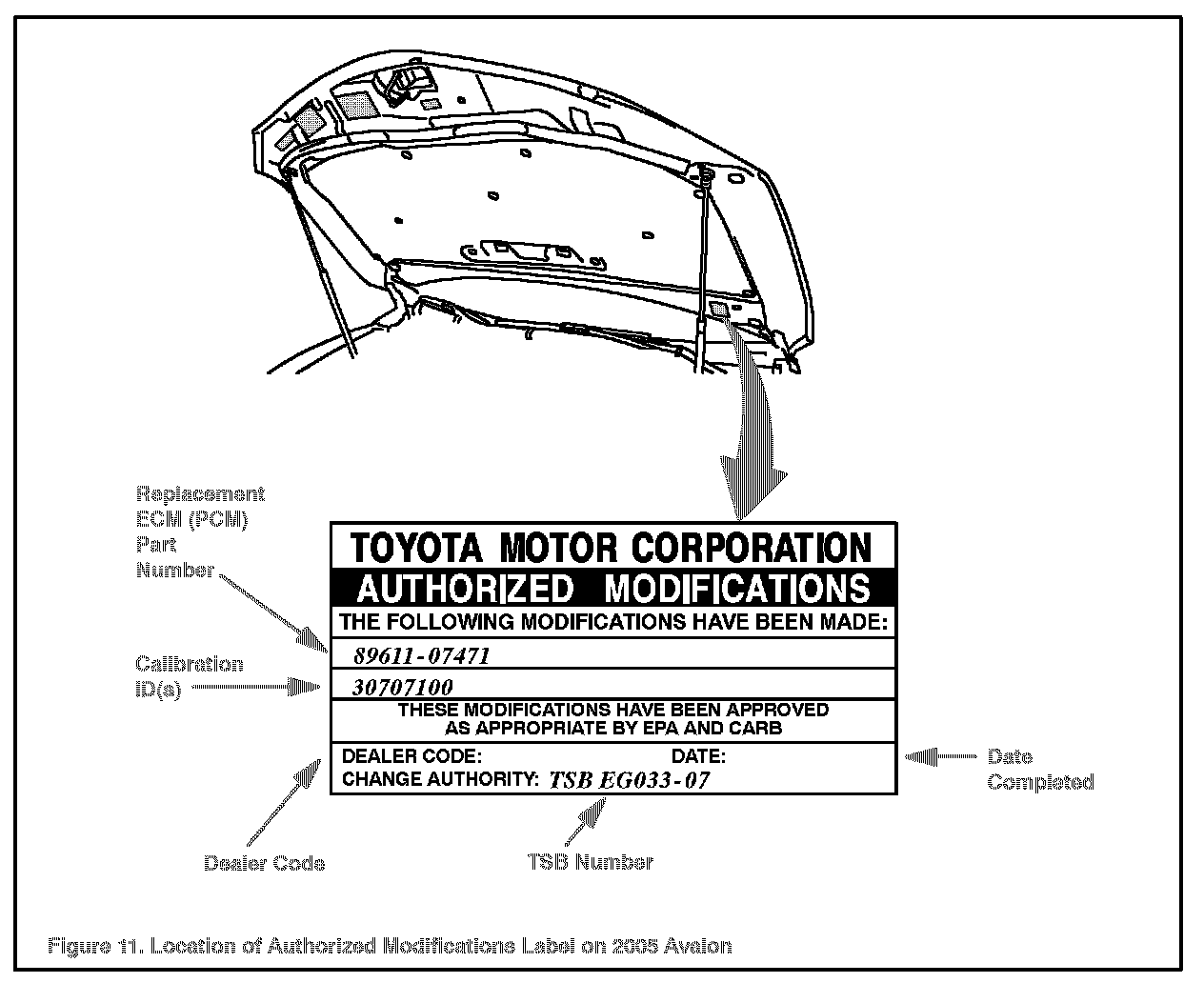 1. Check for the Authorized Modifications Label affixed to the vehicle in the location shown in Figure 11. Confirm if the ECM (PCM) calibration has been updated. If the calibration ID listed is NOT the latest ECM (PCM) calibration go to step 2.