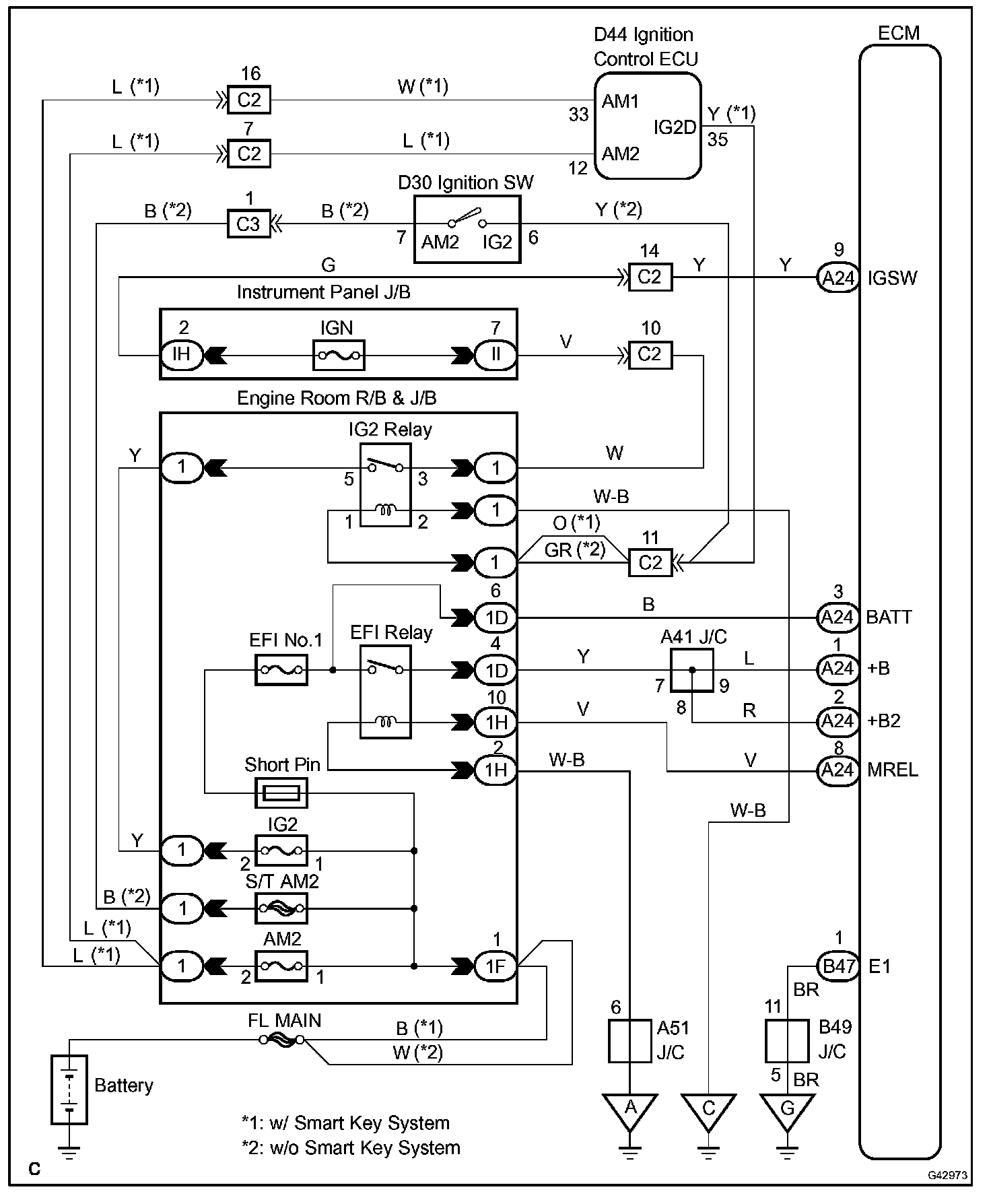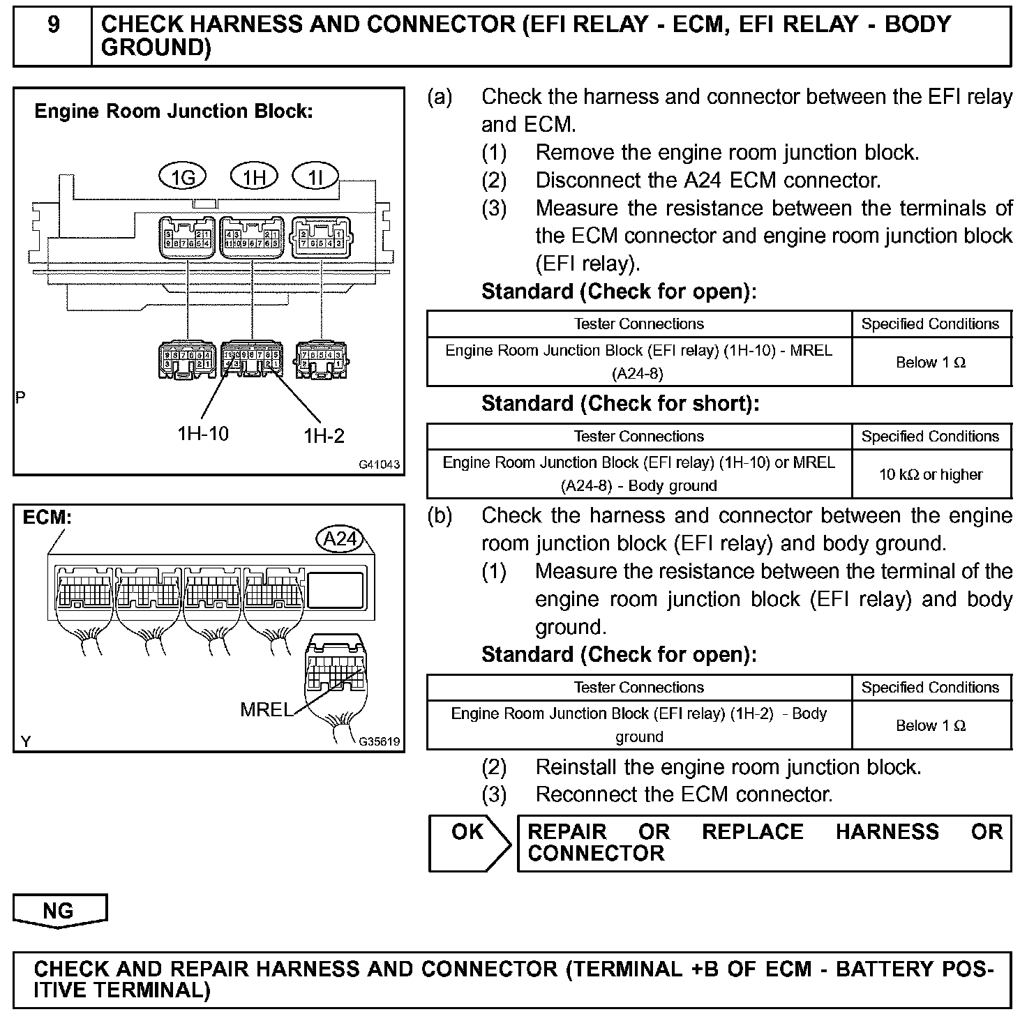 When the ignition switch is turned on (IG), the battery voltage is applied to terminal IGSW of the ECM. The ECM MREL output signal causes a current to flow to the coil, closing the contacts of the EFI relay and supplying power to terminal +B of the ECM.