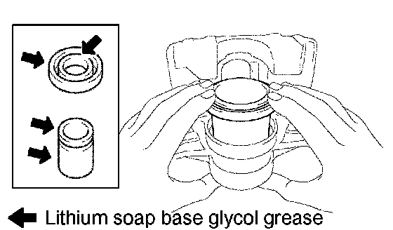 c. Apply lithium soap base glycol grease to the sealing surface of 2 new front disc brake bush dust boots.