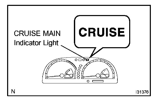 2. Check that the CRUISE MAIN indicator light comes on when the cruise control main switch is turned on, and that the indicator light goes off when the main switch is turned OFF.