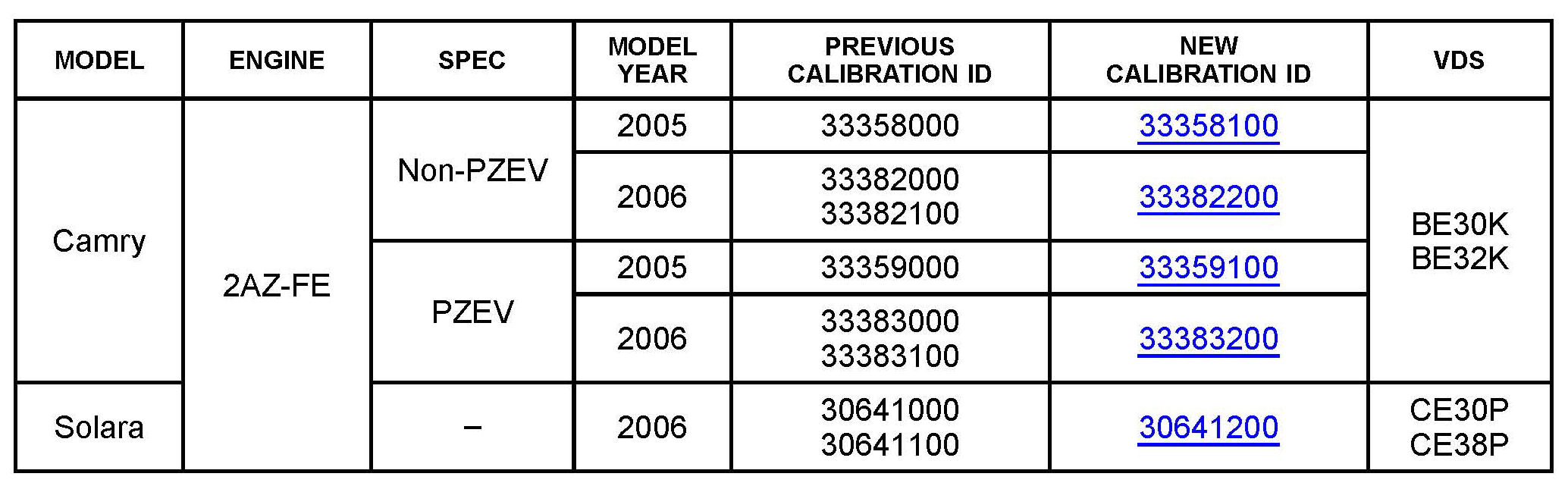 Some 2005 - 2006 model year Camry and 2006 model year Solara vehicles may exhibit a MIL "ON" condition with Diagnostic Trouble Code (DTC) P0500 - Vehicle Speed Sensor "A". The Engine Control Module/ECM (SAE term: Powertrain Control Module/PCM) logic has been modified to reduce the possibility of this condition occurring. Use the following repair procedure to address this condition.