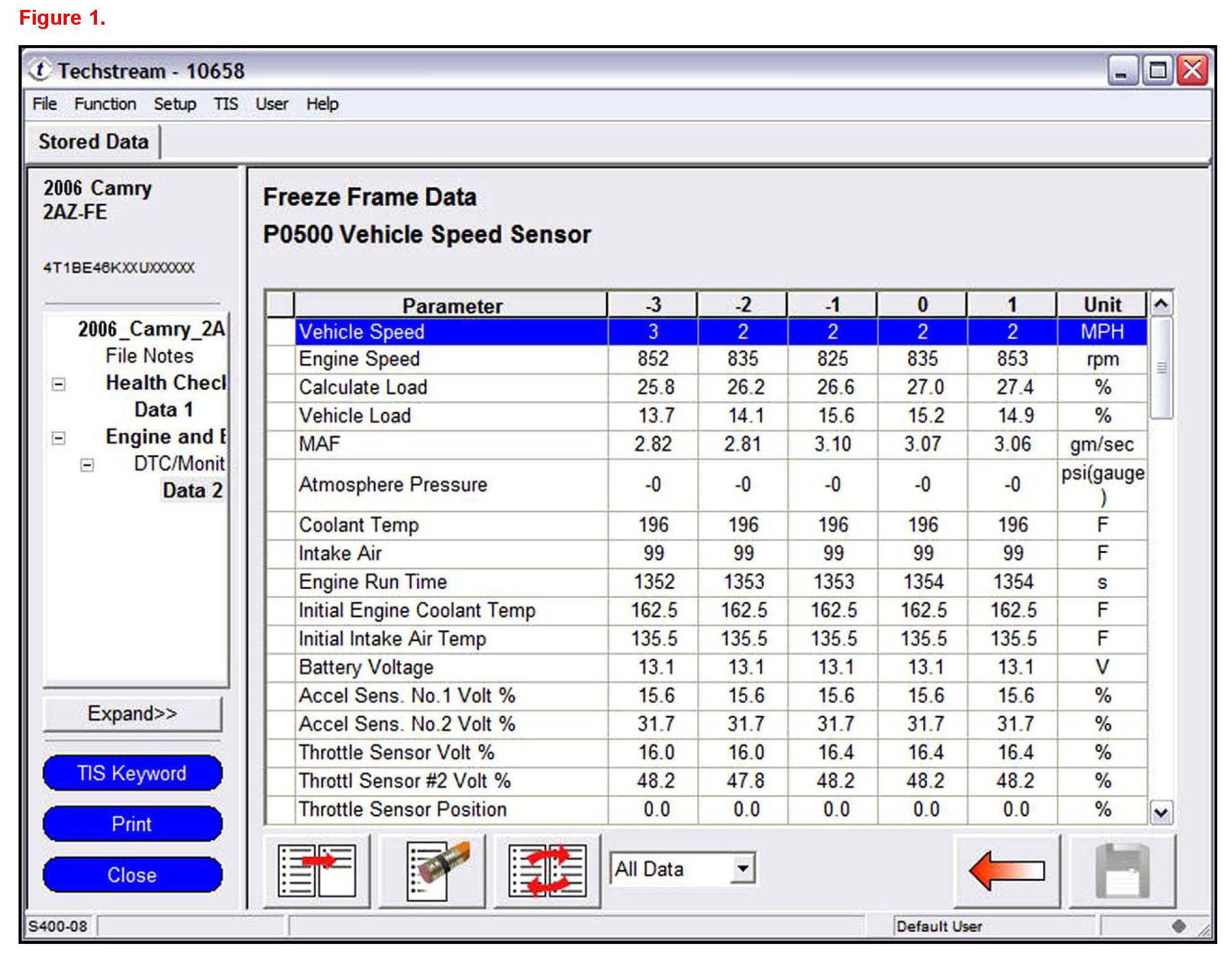 1. Inspect the Freeze Frame Data stored under "Engine and ECT" with the DTC P0500. (See Figure 1.)