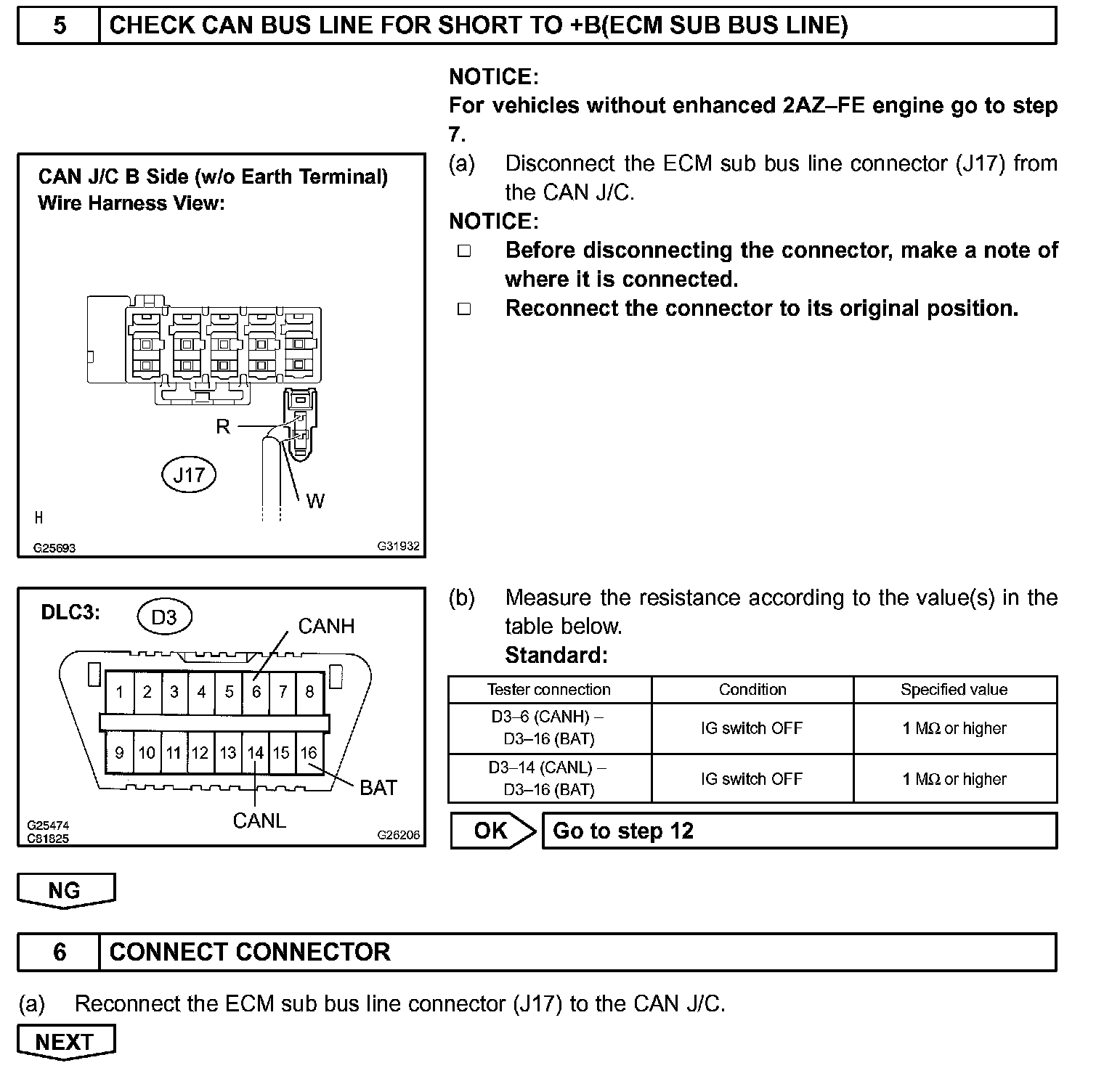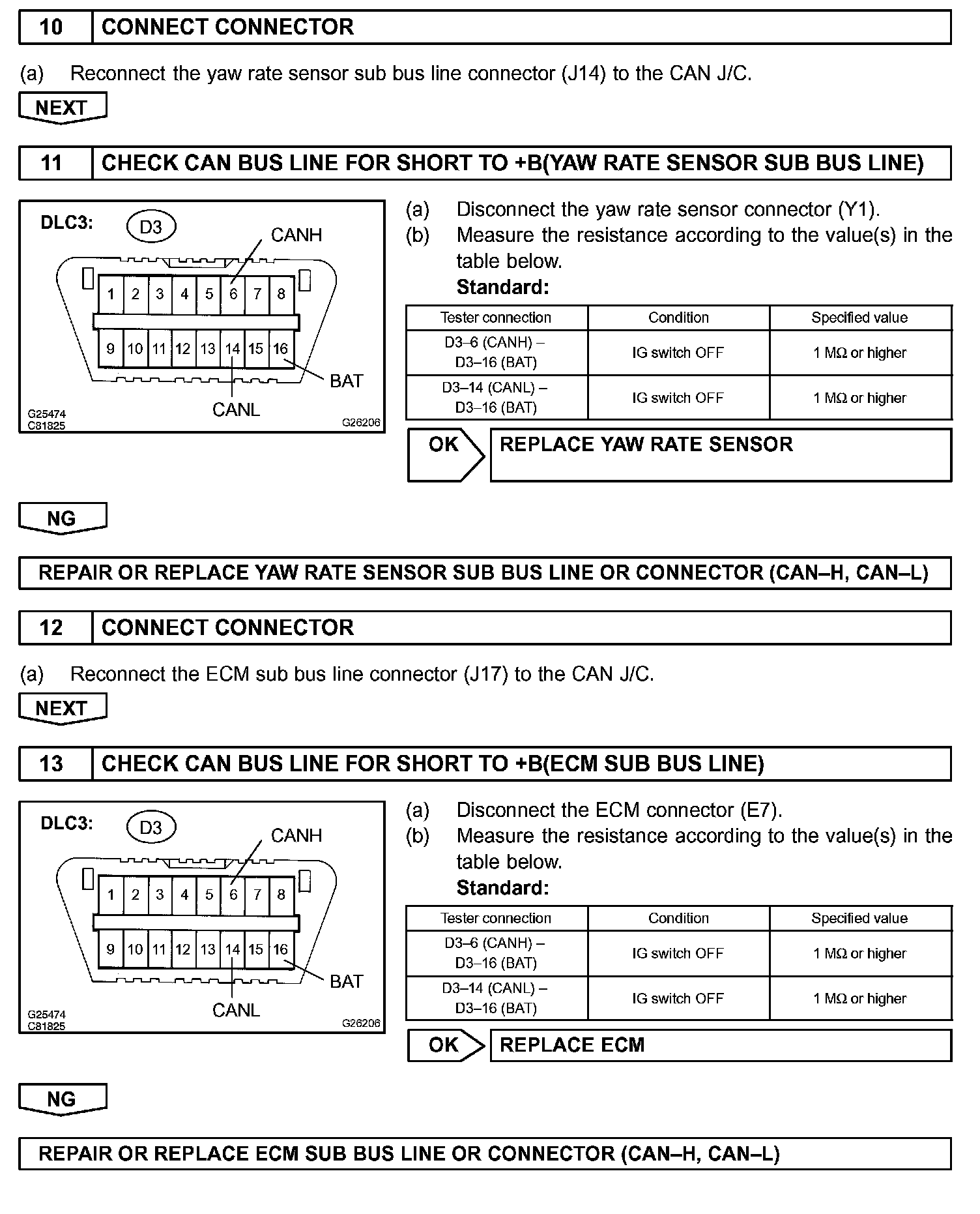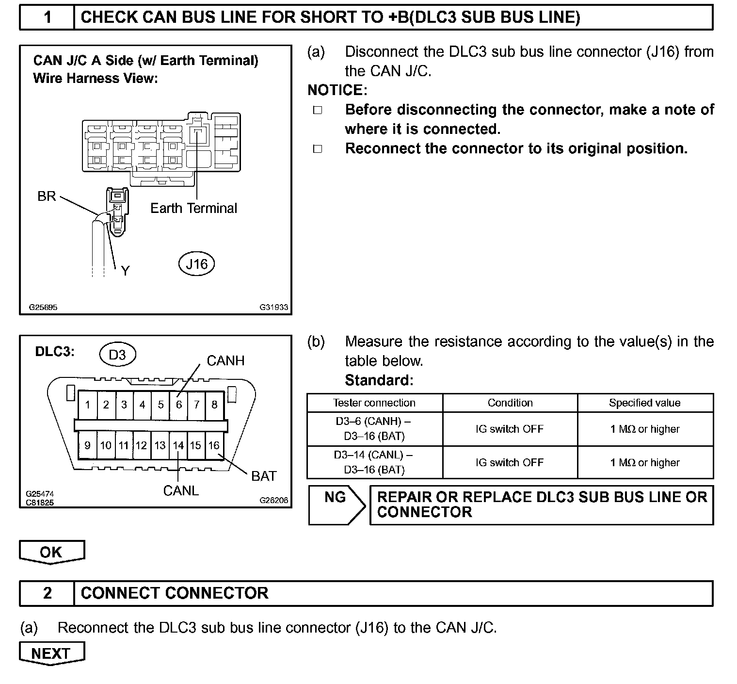 CHECK CAN BUS LINE FOR SHORT TO +B CIRCUIT DESCRIPTION A short to +B is suspected in the CAN bus line when there is continuity between terminals 16 (BAT) and 6 (CANH) or terminals 16 (BAT) and 14 (CANL) of the