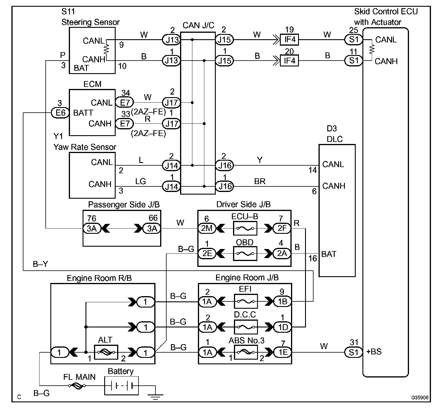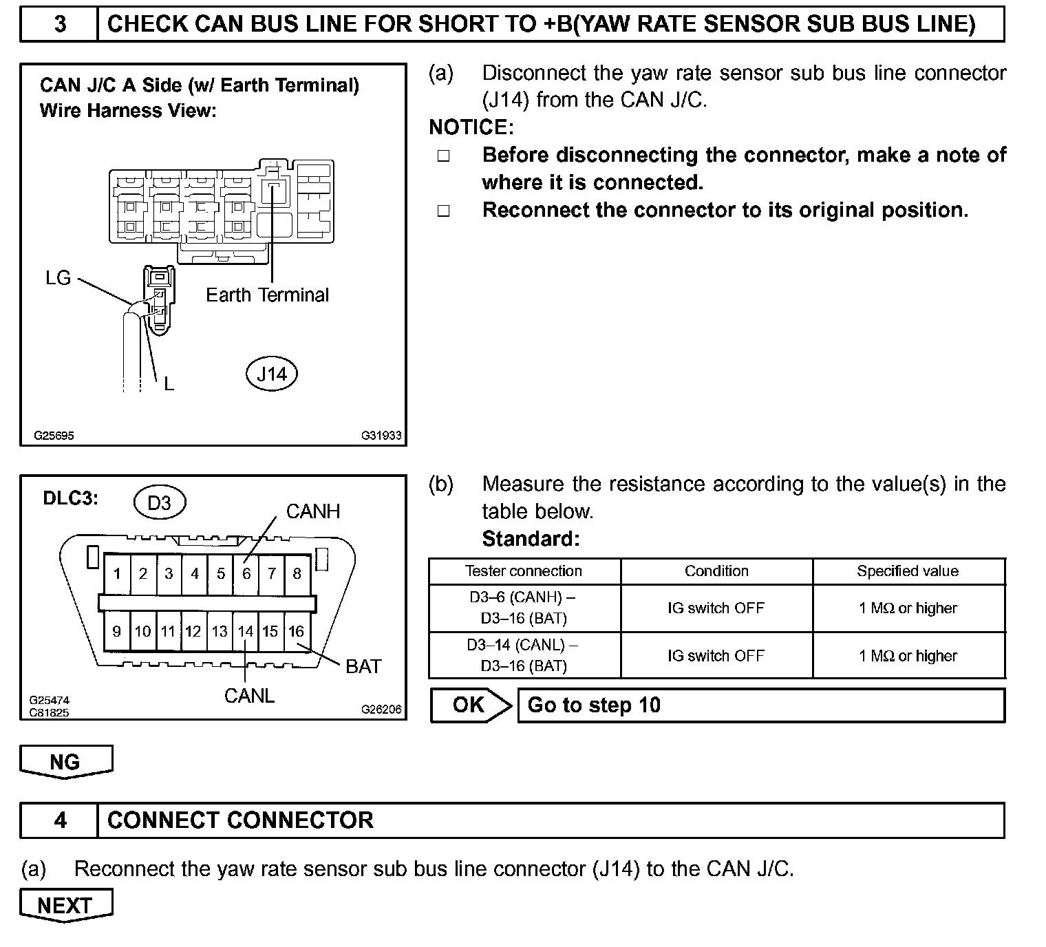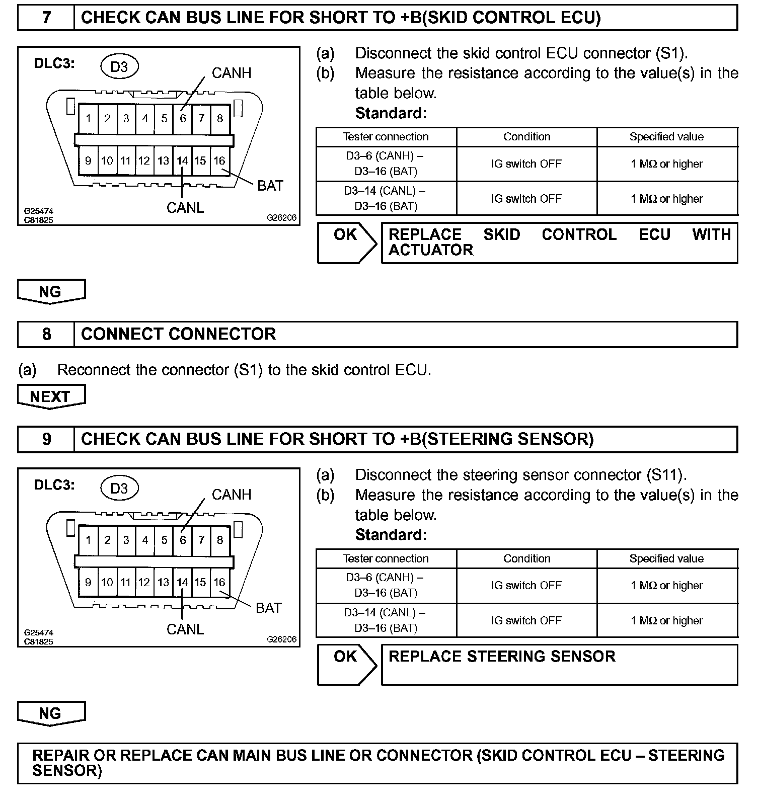 CHECK CAN BUS LINE FOR SHORT TO +B CIRCUIT DESCRIPTION A short to +B is suspected in the CAN bus line when there is continuity between terminals 16 (BAT) and 6 (CANH) or terminals 16 (BAT) and 14 (CANL) of the