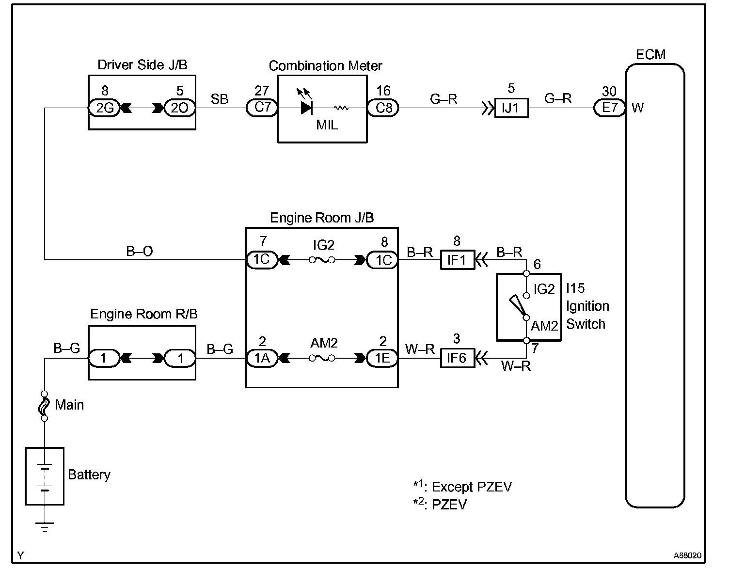 The Malfunction Indicator Lamp (MIL) is used to indicate the ECM's detection of a vehicle malfunction. The instrument panel IG2 fuse provides circuit power and the ECM provides the circuit ground that illuminates the MIL.