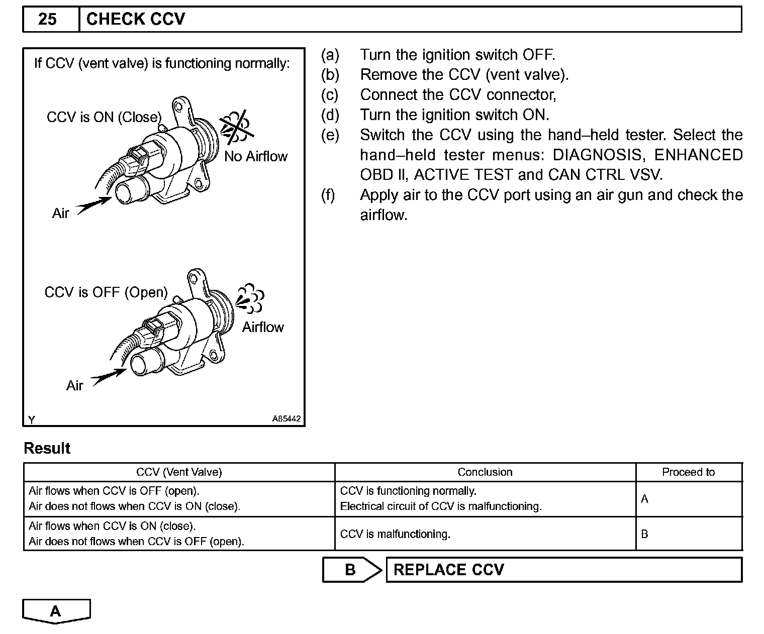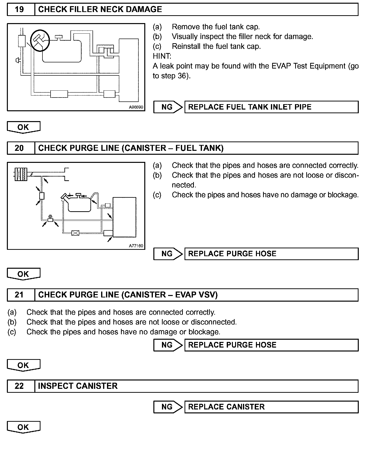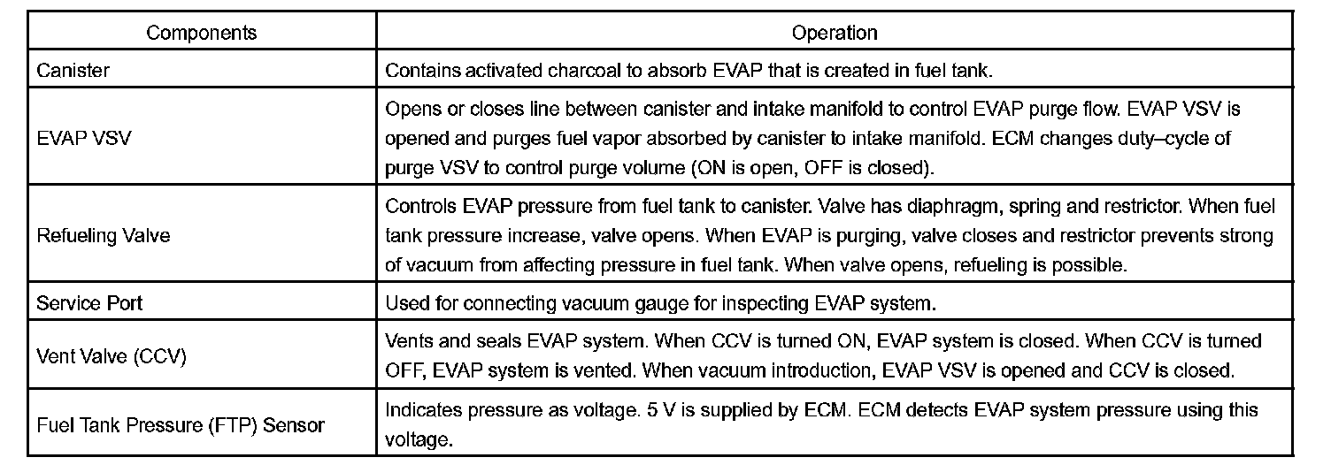 When predetermined conditions (closed loop, etc.) are met, the EVAP VSV is opened and stored fuel vapor in the canister is purged to the intake manifold. The ECM changes duty-cycle to the EVAP VSV to control purge flow volume. Purge flow volume is determined by the intake manifold pressure. Atmospheric pressure is allowed into the canister through the vent valve (CCV) to ensure that purge flow is maintained when negative pressure (vacuum) is applied to the canister. This EVAP system contains the components: