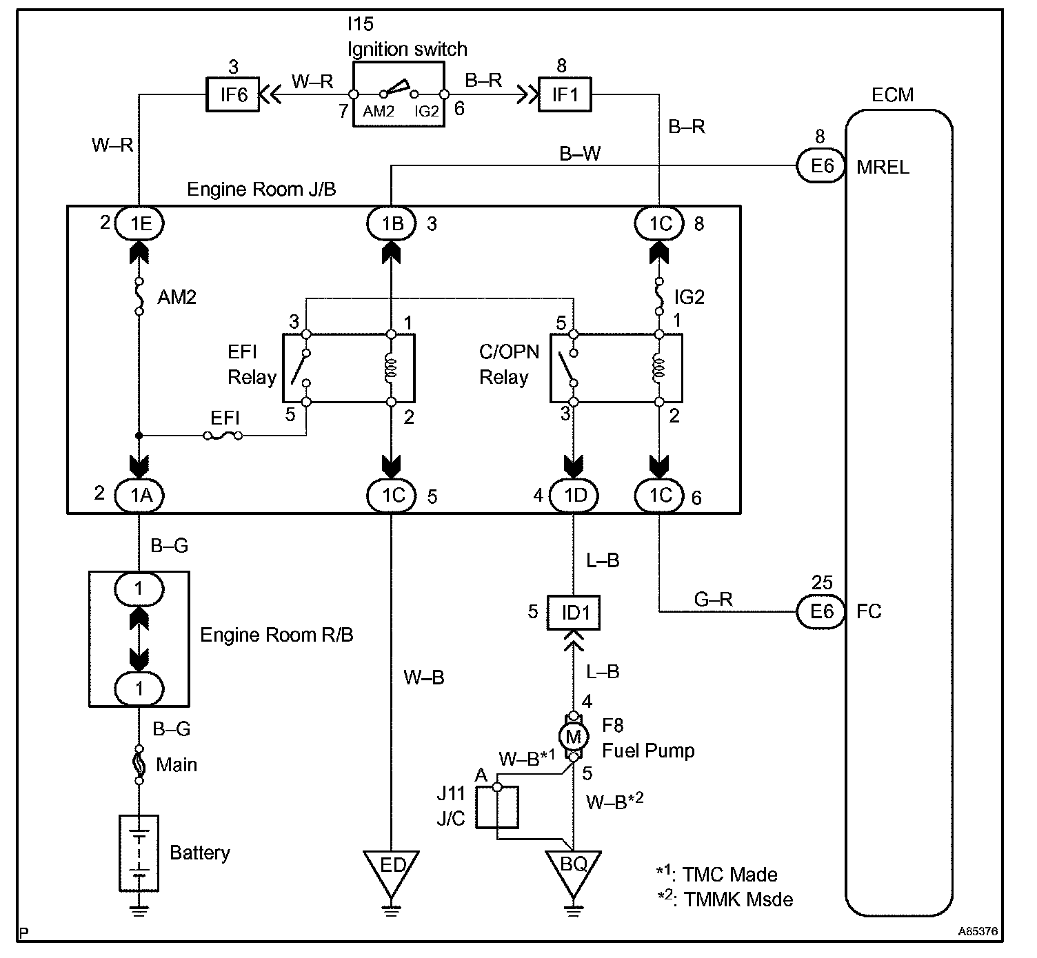 When the STA signal and NE signal are input to the ECM, Tr is turned ON, current flows to coil of the circuit opening relay (Marking: C/OPN), the relay switches on, power is supplied to the fuel pump and the fuel pump operates.