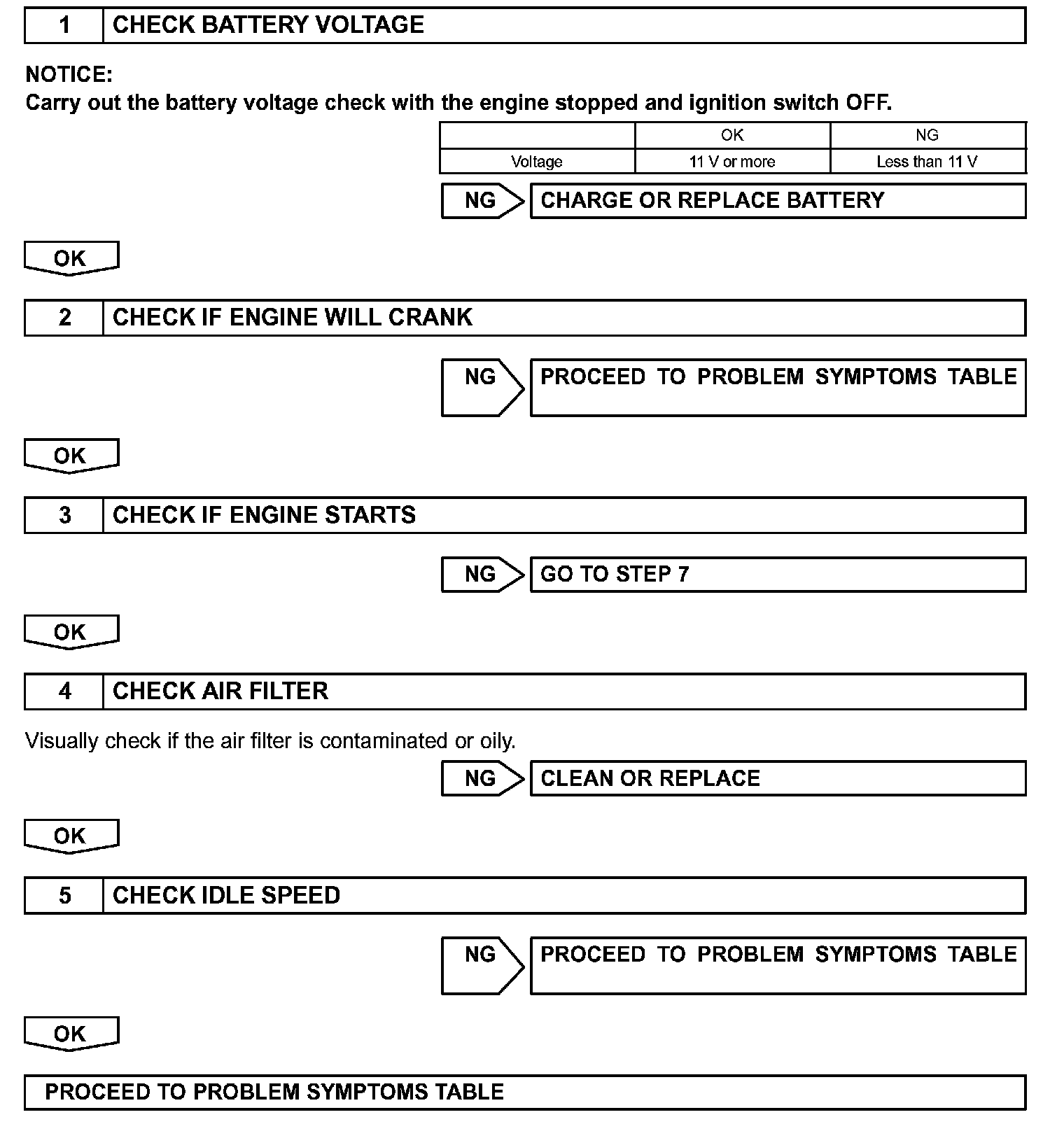 When the malfunction is not confirmed in the DTC check, troubleshooting should be carried out in all the possible circuits considered as possible causes of the problem. In many cases, by carrying out the basic engine check shown in the flowchart, the problem can be found quickly and efficiently. Therefore, using this check is essential in the engine troubleshooting.