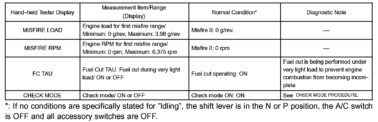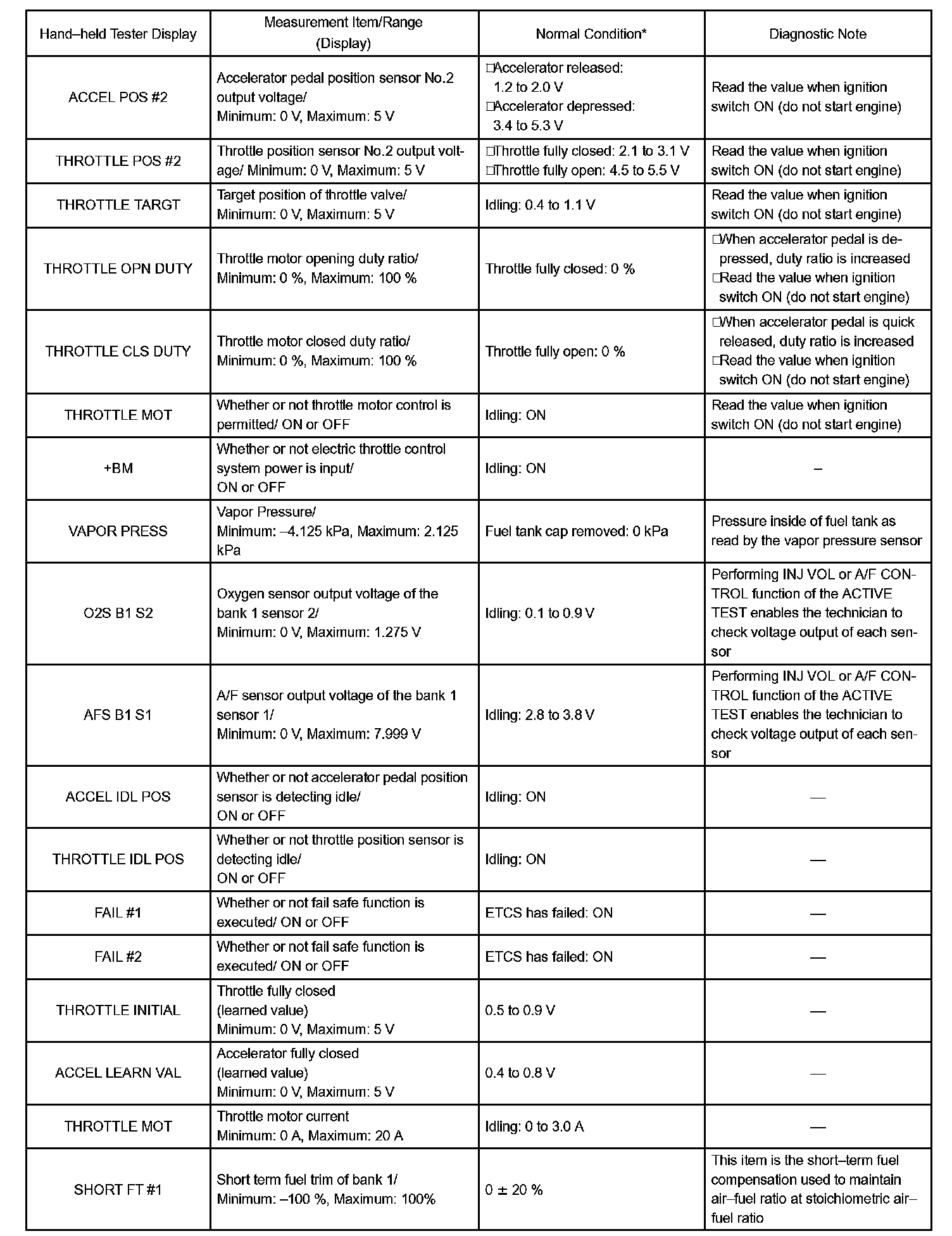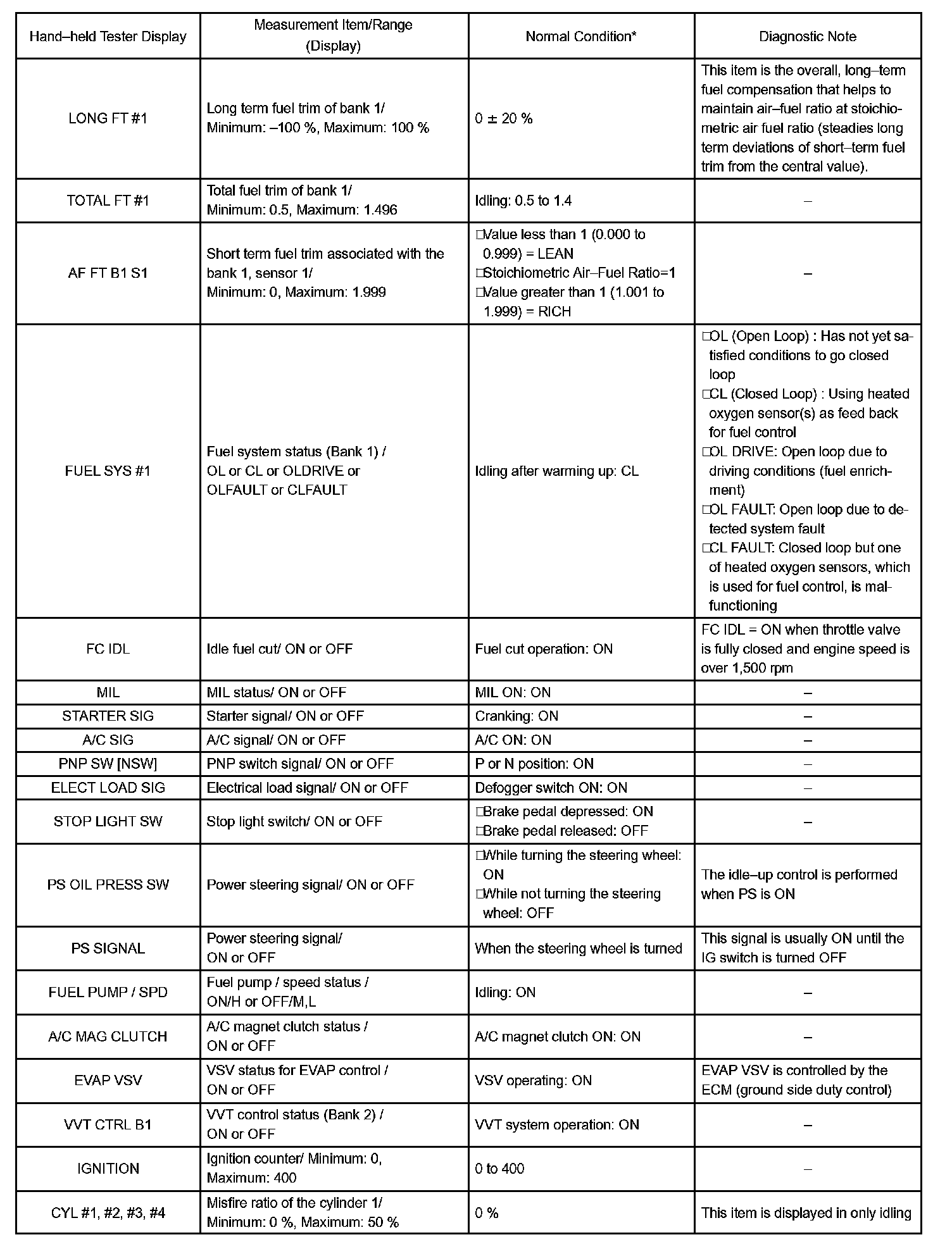 DATA LISTHINT: Using the hand-held tester DATA LIST allows switch, sensor, actuator and other item values to be read without removing any parts. Reading the DATA LIST early in troubleshooting is one way to shorten labor time.