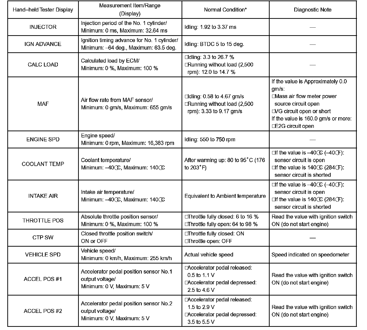 DATA LISTHINT: Using the hand-held tester DATA LIST allows switch, sensor, actuator and other item values to be read without removing any parts. Reading the DATA LIST early in troubleshooting is one way to shorten labor time.