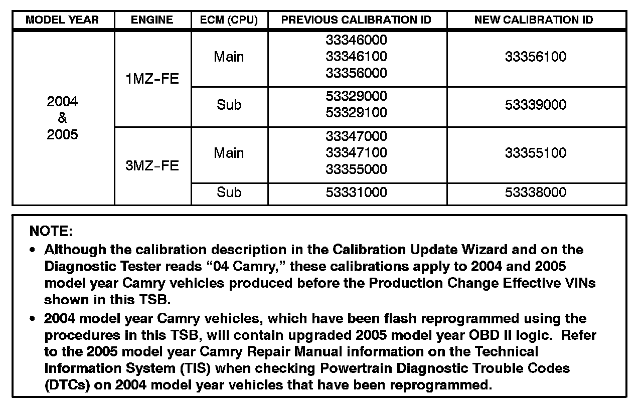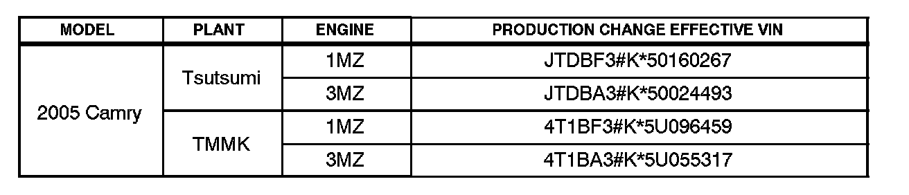 ^ 2005 model year Camry vehicles equipped with 1MZ-FE or 3MZ-FE engine produced BEFORE the Production Change Effective VINs shown on the next page.