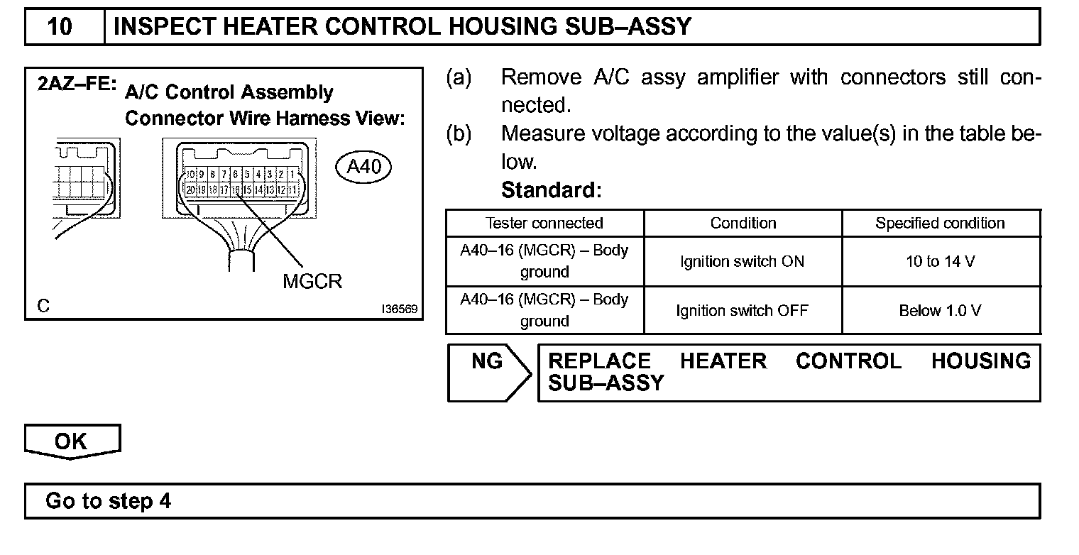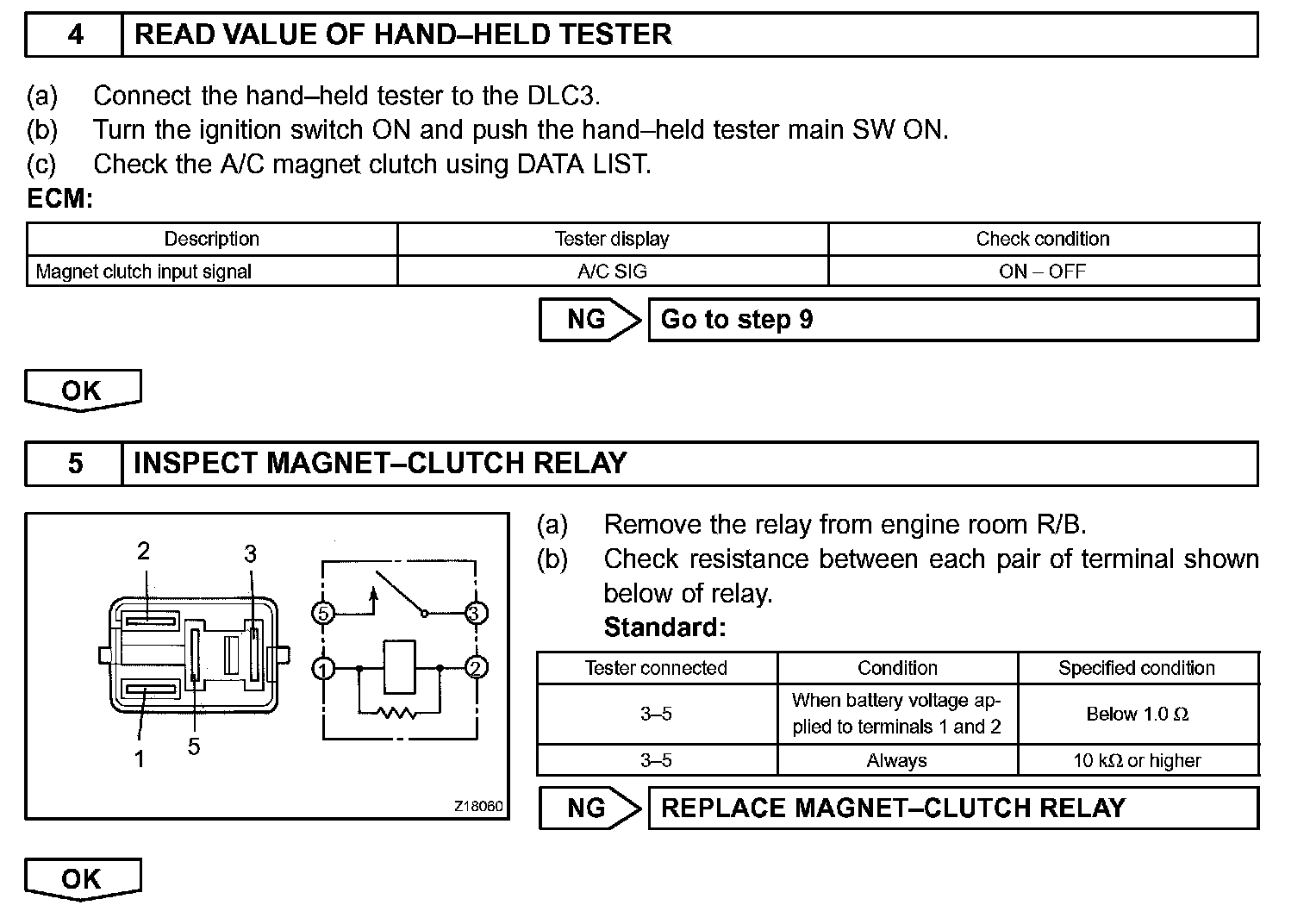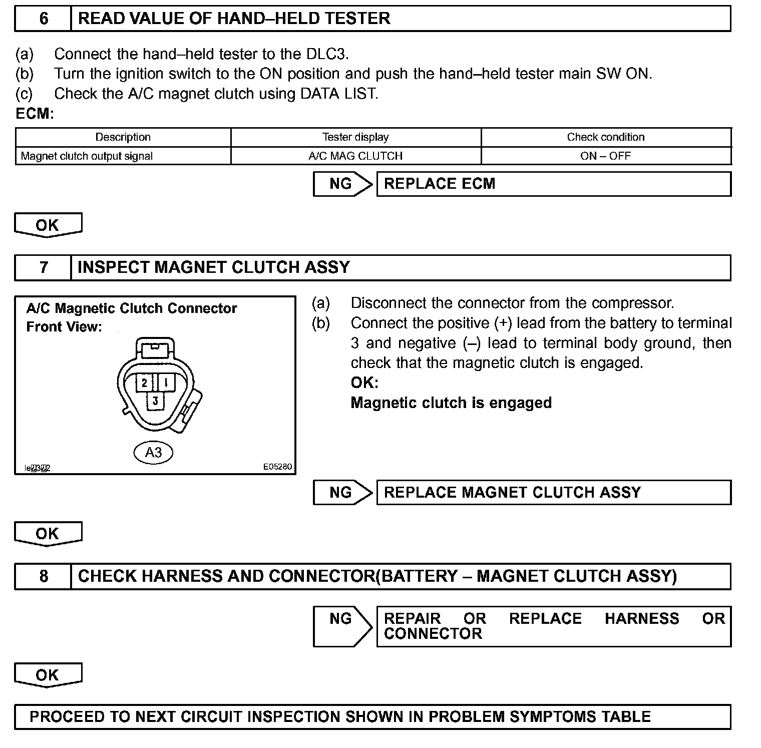 The A/C amplifier outputs the magnetic clutch ON signal from terminal AC1 to the ECM receives this signal, it sends a signal from terminal ACMG (MGCR) and switches the magnetic clutch relay ON, thus turning on the magnetic clutch.