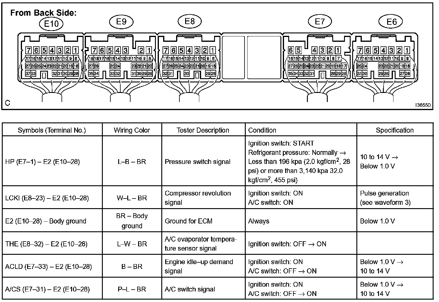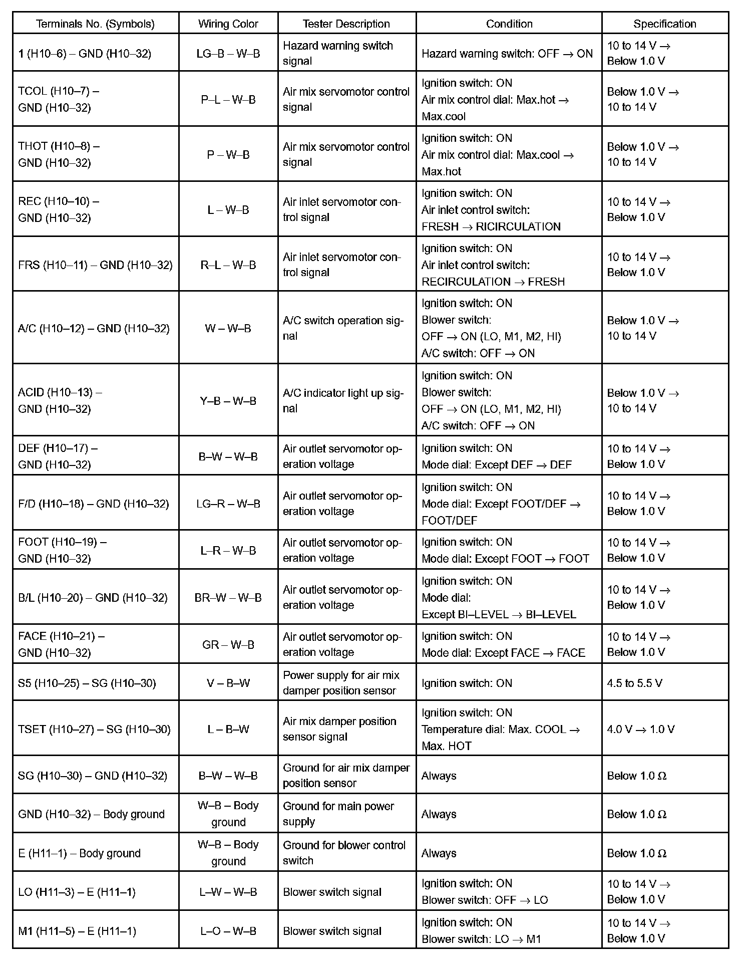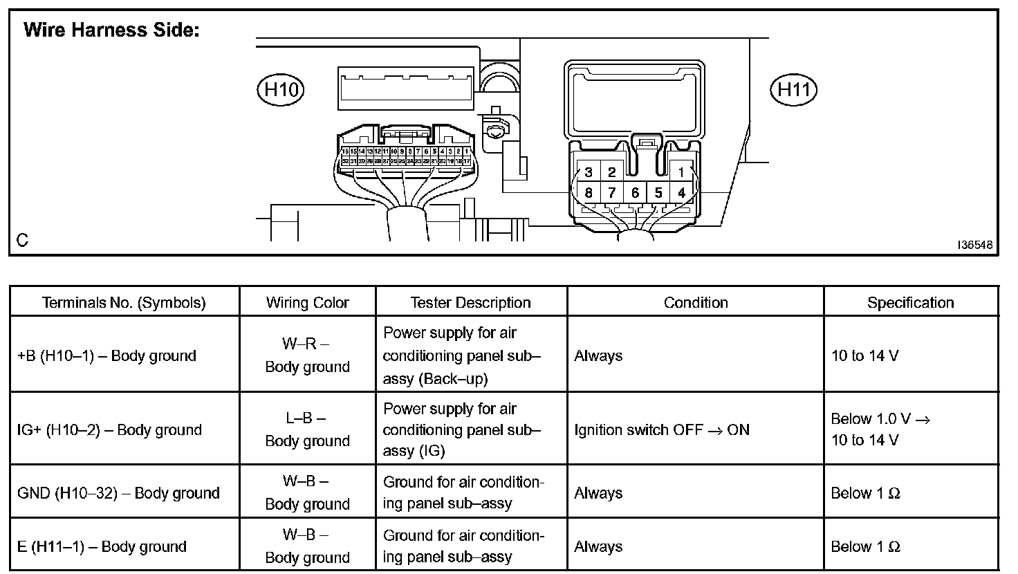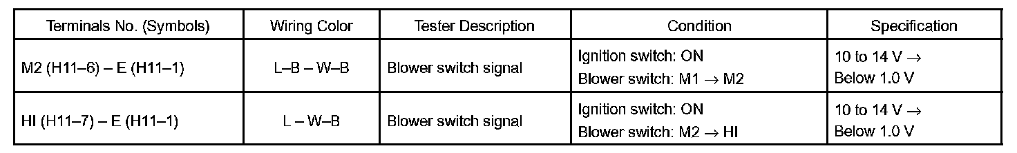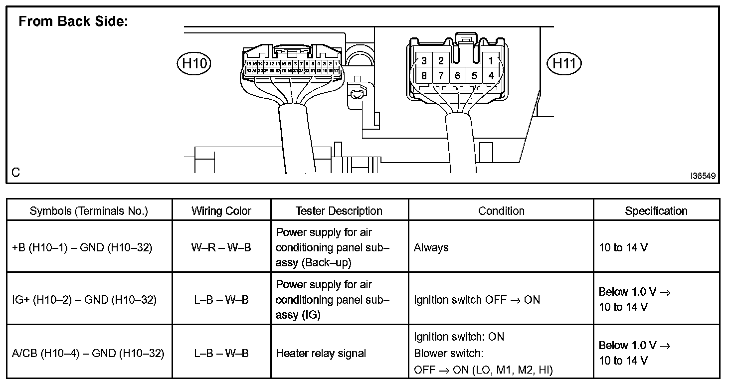 b. Connect the connector to heater controller and inspect wire harness side from the back side, as shown in the chart.