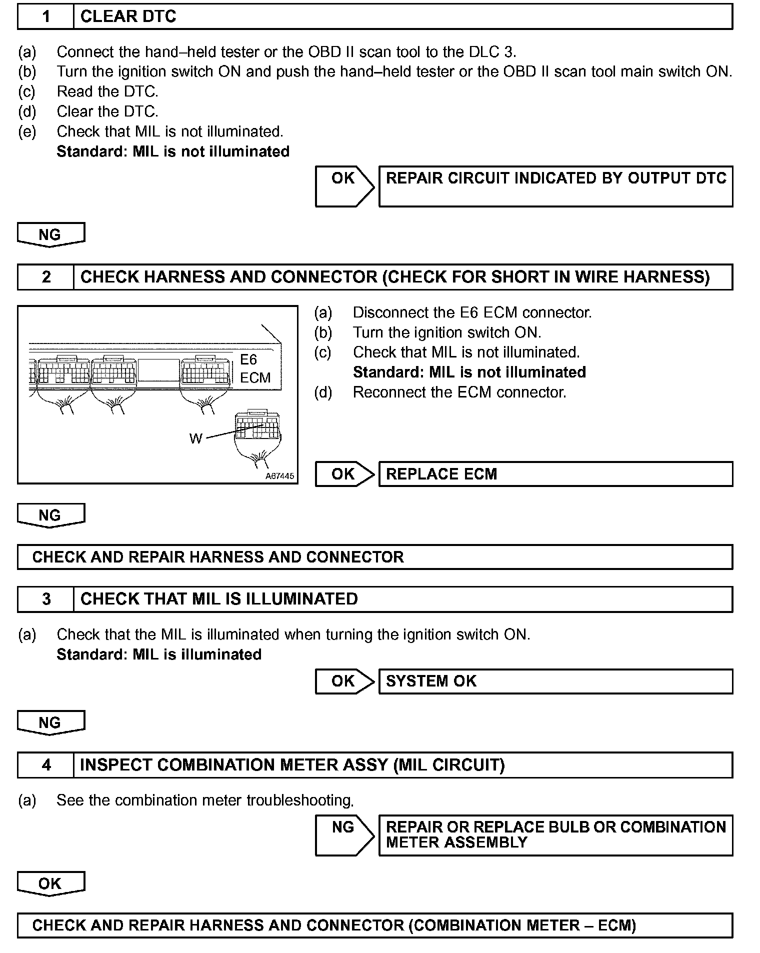 The MIL should be illuminated when the ignition is first turned on. If the MIL is always ON or OFF, use hand-held tester or OBD II scan tool and follow the procedures below to determine the cause of the problem.