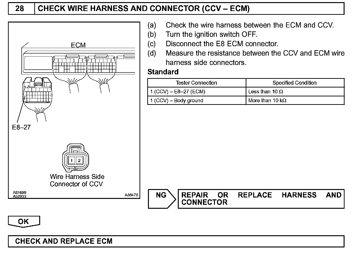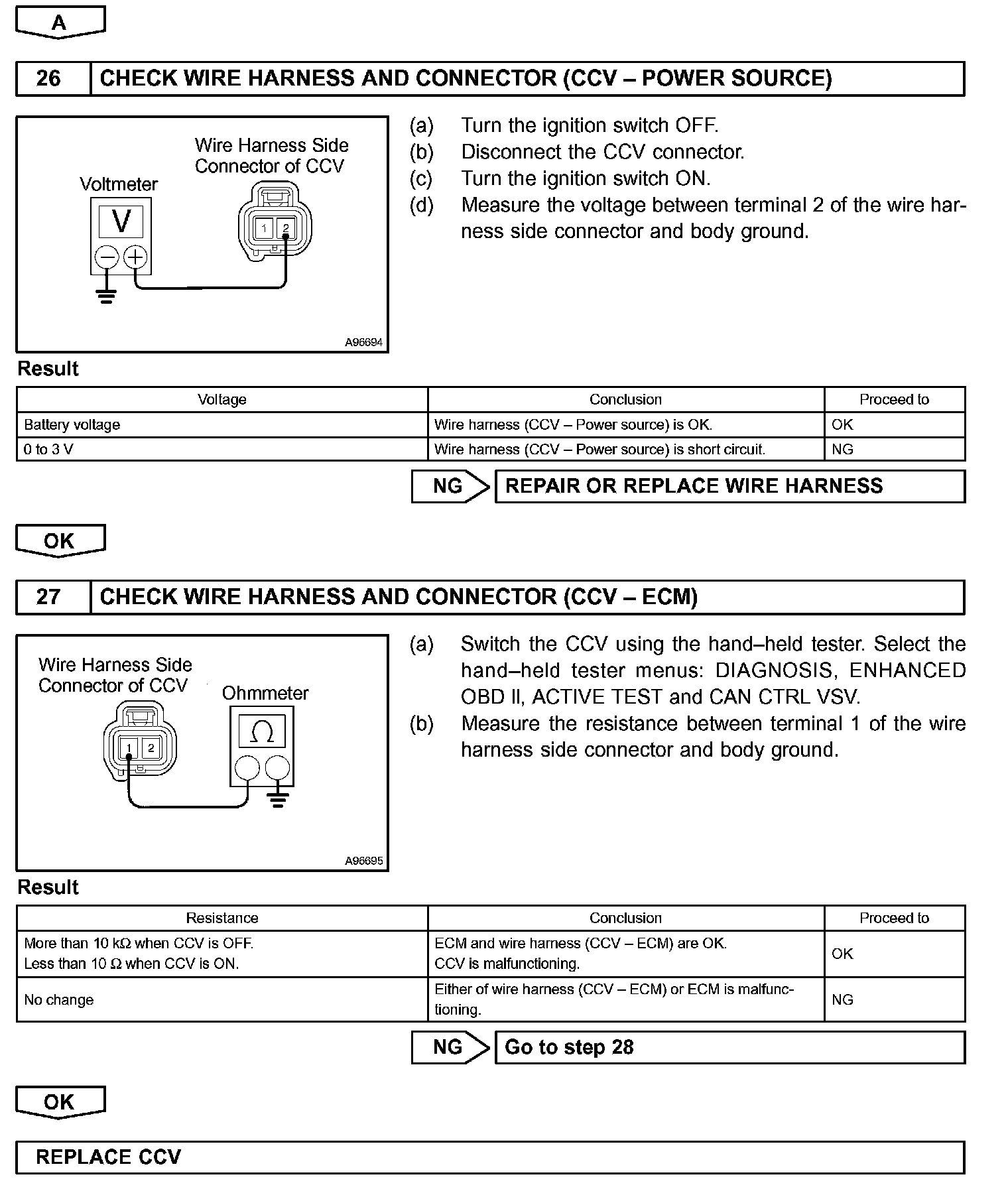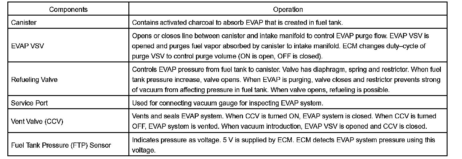 When predetermined conditions (closed loop, etc.) are met, the EVAP VSV is opened and stored fuel vapor in the canister is purged to the intake manifold. The ECM changes duty-cycle to the EVAP VSV to control purge flow volume. Purge flow volume is determined by the intake manifold pressure. Atmospheric pressure is allowed into the canister through the vent valve (CCV) to ensure that purge flow is maintained when negative pressure (vacuum) is applied to the canister. This EVAP system contains components: